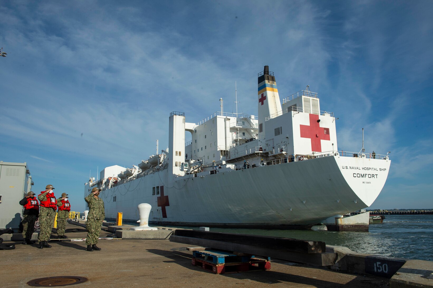 200502-N-OS895-1042 NORFOLK (May 2, 2020) The hospital ship USNS Comfort (T-AH 20) returns to its homeport of Naval Station Norfolk after treating patients in New York and New Jersey in support of the COVID-19 pandemic. The ship and its embarked medical task force remain prepared for future tasking. The Navy, along with other U.S. Northern Command dedicated forces, remains engaged throughout the nation in support of the broader COVID-19 response. (U.S. Navy photo by Mass Communication Specialist 1st Class Jason Pastrick/Released)