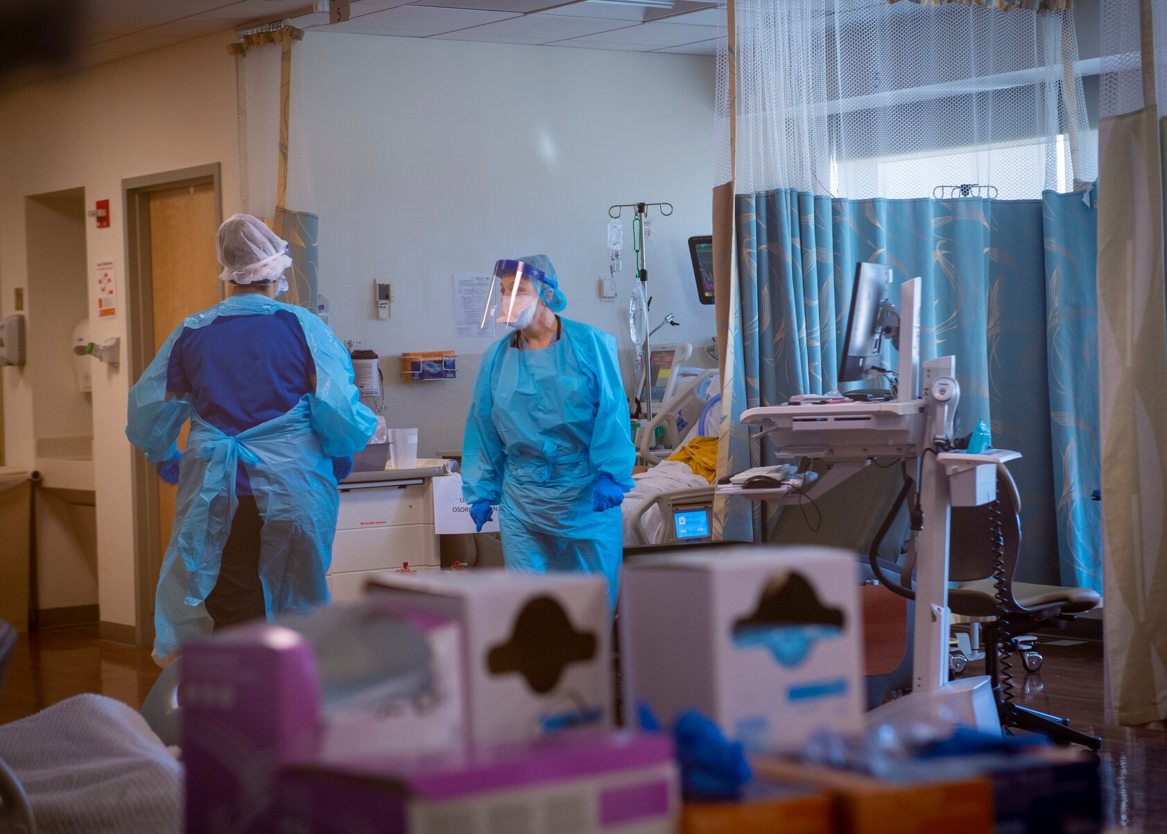 200505-N-WJ362-0034 NEW YOrK (May 5, 2020) U.S. Army Col. Patricia Goodyear, an acute care nurse practitioner, speaks to a coworker at Queens Hospital Center, May 5, 2020. Military medical providers assigned to the hospital collaborate as an integrated system to relieve the New York City medical system, as part of the Department of Defense COVID-19 response. U.S. Northern Command, through U.S. Army North, remains committed to providing flexible Department of Defense support to the Federal Emergency Management Agency for the whole-of-nation COVID-19 response. (U.S. Navy photo by Mass Communication Specialist 1st Class Kleynia R. McKnight/Released)