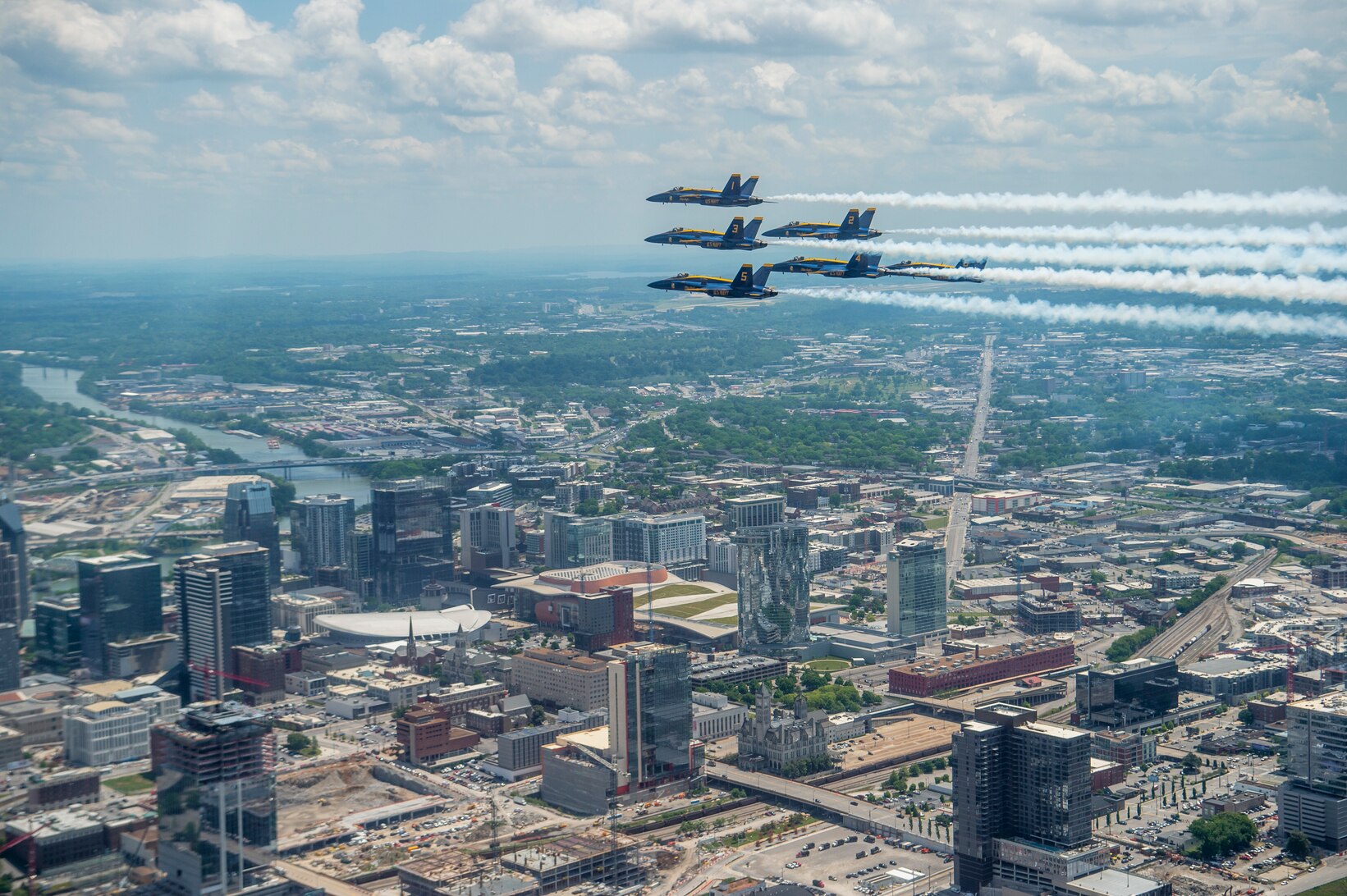 200514-N-YO638-1225 NASHVILLE (May 14, 2020) The U.S. Navy Flight Demonstration Squadron, the Blue Angels honored frontline COVID-19 first responders and essential workers with formation flights over Nashville and Little Rock on May 14, 2020. (U.S. Navy photo by Mass Communication Specialist 2nd Class Cody Hendrix/Released)