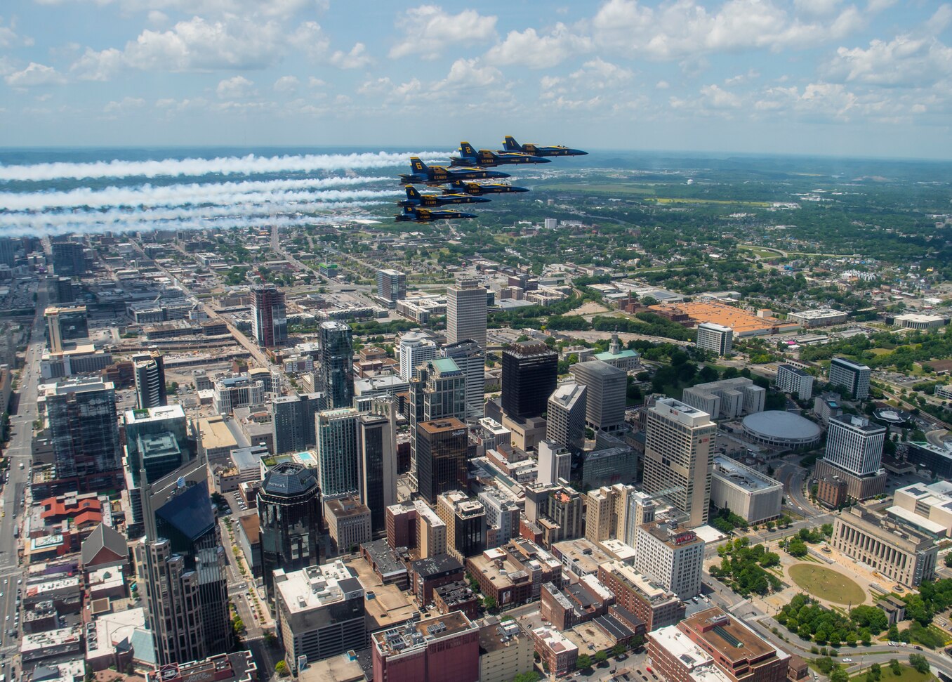 200514-N-YO638-1303 NASHVILLE (May 14, 2020) The U.S. Navy Flight Demonstration Squadron, the Blue Angels honored frontline COVID-19 first responders and essential workers with formation flights over Nashville and Little Rock on May 14, 2020. (U.S. Navy photo by Mass Communication Specialist 2nd Class Cody Hendrix/Released)