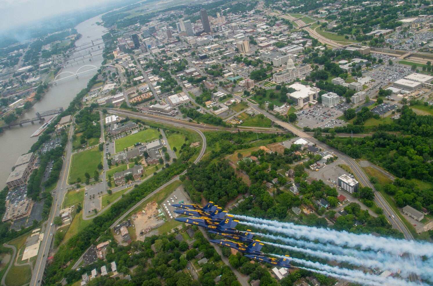 200514-N-YO638-1567 LITTLE ROCK, Ark. (May 14, 2020) The U.S. Navy Flight Demonstration Squadron, the Blue Angels honored frontline COVID-19 first responders and essential workers with formation flights over Nashville and Little Rock on May 14, 2020. (U.S. Navy photo by Mass Communication Specialist 2nd Class Cody Hendrix/Released)