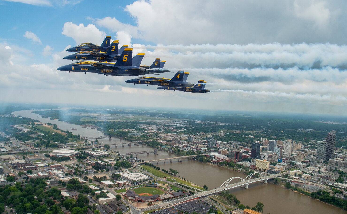 200514-N-YO638-1589 LITTLE ROCK, Ark. (May 14, 2020) The U.S. Navy Flight Demonstration Squadron, the Blue Angels honored frontline COVID-19 first responders and essential workers with formation flights over Nashville and Little Rock on May 14, 2020. (U.S. Navy photo by Mass Communication Specialist 2nd Class Cody Hendrix/Released)
