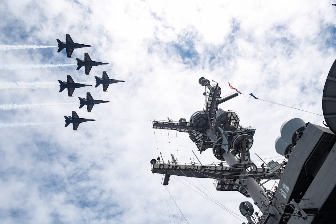 200520-N-WO152-0172 ATLANTIC OCEAN (May 20, 2020) The U.S. Navy Flight Demonstration Squadron, the Blue Angels, fly over the Nimitz-class aircraft carrier USS Harry S. Truman (CVN 75) on a return transit to Naval Air Station Pensacola, Florida, following their annual flight over the U.S. Naval Academy commissioning ceremony, May 20, 2020. The Harry S. Truman Carrier Strike Group (HSTCSG) remains at sea in the Atlantic as a certified carrier strike group force ready for tasking in order to protect the crew from the risks posed by COVID-19, following their successful deployment to the U.S. 5th and 6th Fleet areas of operation. (U.S. Navy photo by Mass Communication Specialist 3rd Class Samuel Gruss/Released)