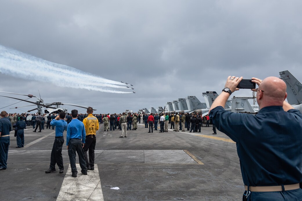 200520-N-WO152-0185 ATLANTIC OCEAN (May 20, 2020) Sailors watch the U.S. Navy Flight Demonstration Squadron, the Blue Angels, fly over the Nimitz-class aircraft carrier USS Harry S. Truman (CVN 75) on a return transit to Naval Air Station Pensacola, Florida, following their annual flight over the U.S. Naval Academy commissioning ceremony, May 20, 2020. The Harry S. Truman Carrier Strike Group (HSTCSG) remains at sea in the Atlantic as a certified carrier strike group force ready for tasking in order to protect the crew from the risks posed by COVID-19, following their successful deployment to the U.S. 5th and 6th Fleet areas of operation. (U.S. Navy photo by Mass Communication Specialist 3rd Class Samuel Gruss/Released)