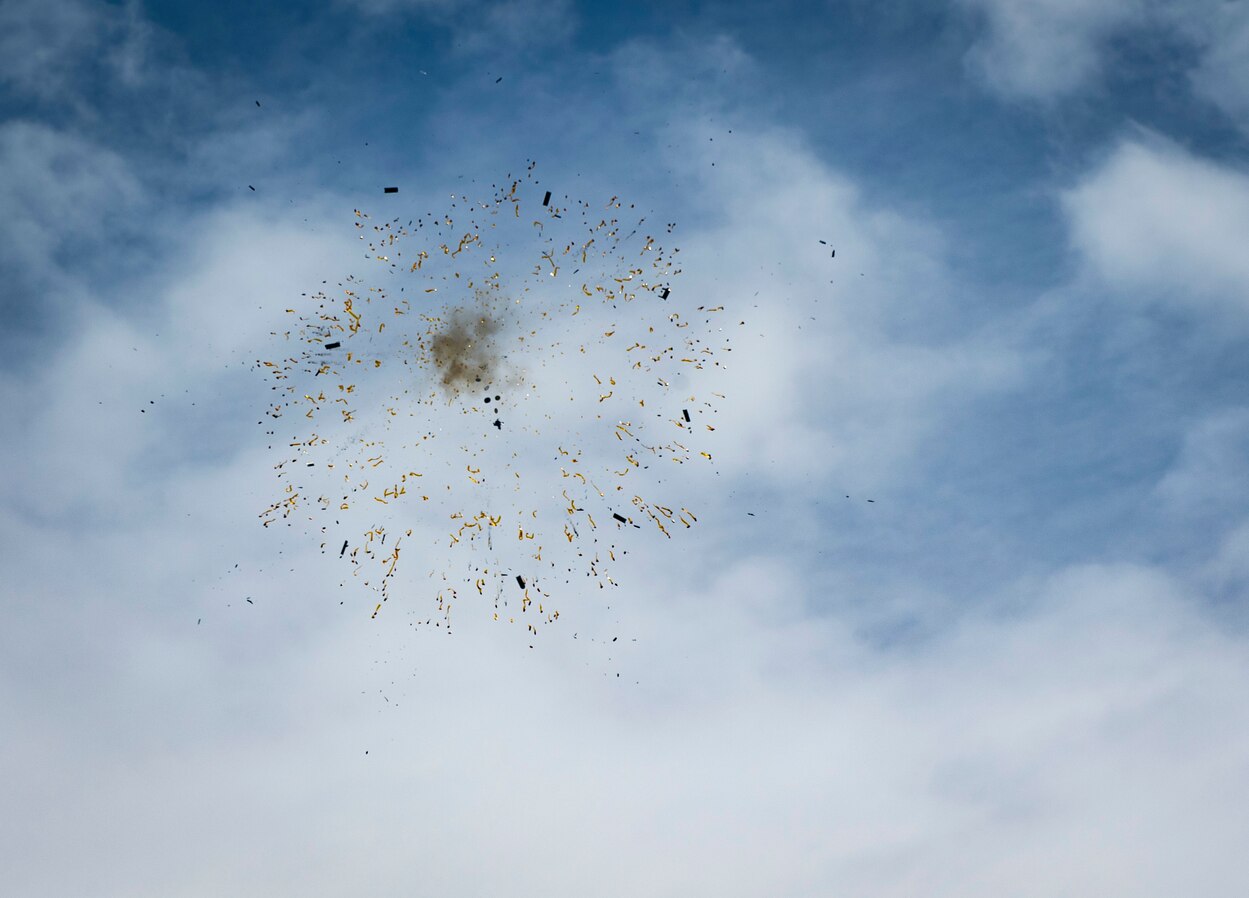200528-N-RG482-0611 NORTH SEA (May 28, 2020) Chaff launched from a MK36 chaff launcher aboard the Blue Ridge-class command and control ship USS Mount Whitney (LCC 20) explodes while in the North Sea, May 28, 2020. Mount Whitney is the U.S. 6th Fleet flagship, homeported in Gaeta, Italy, and operates with a combined crew of U.S. Sailors and Military Sealift Command civil service mariners. (U.S. Navy photo by Mass Communication Specialist 1st Class Kyle Steckler/Released)