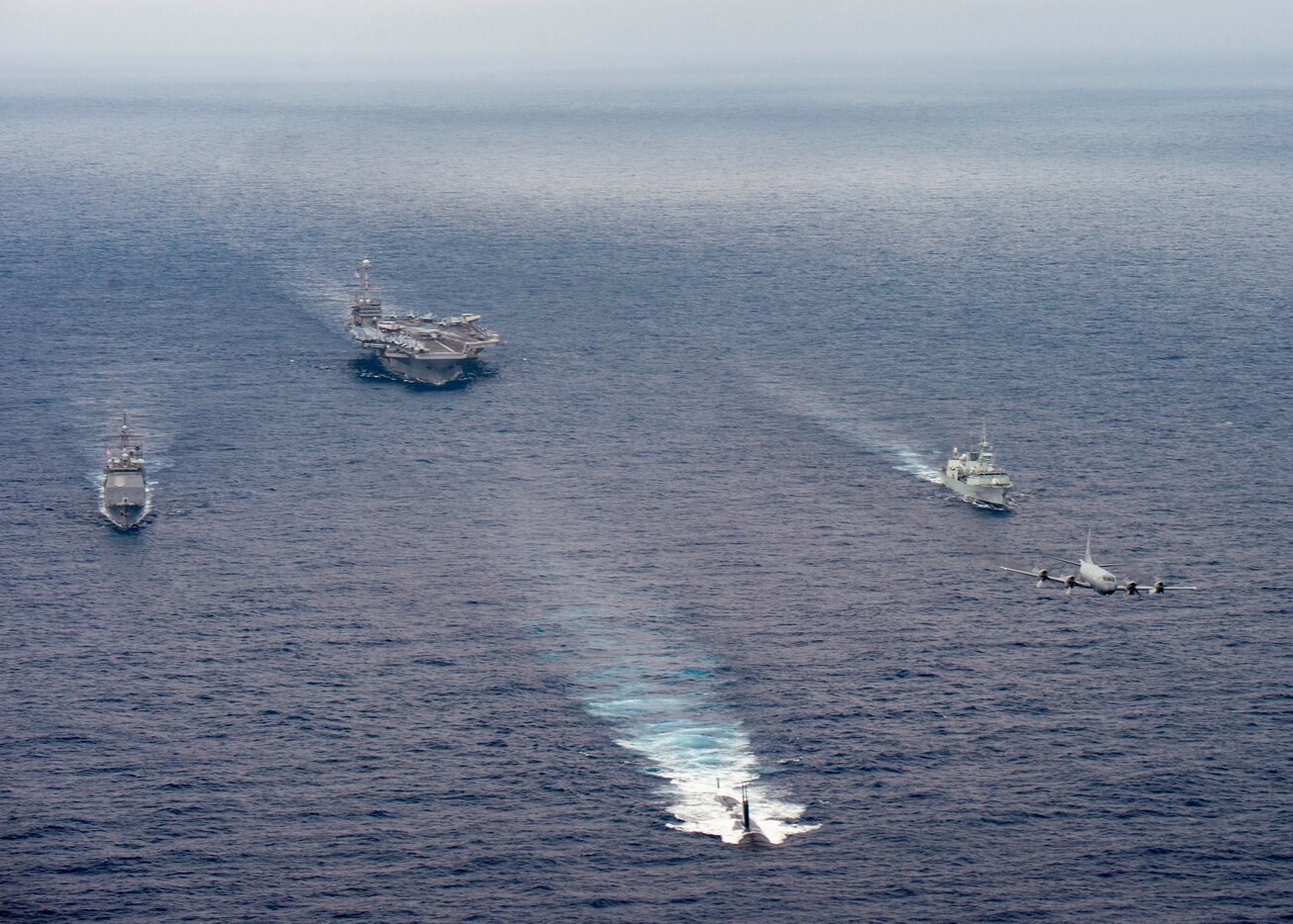 200531-N-BD352-0098 ATLANTIC OCEAN (May 31, 2020) The Royal Canadian Navy Halifax-class frigate HMCS Ville de Quebe (FFH 332), right, the Los Angeles-class fast-attack submarine USS Montpelier (SSN 765), the Nimitz-class aircraft carrier USS Harry S. Truman (CVN 75) and the Ticonderoga-class guided-missile cruiser USS Normandy (CG 60) transit in formation with a Royal Canadian Air Force CP-140 Aurora in the North Atlantic Ocean, May 31, 2020. The Harry S. Truman Carrier Strike Group (HSTCSG) remains at sea in the Atlantic Ocean as a certified carrier strike group force maintaining maritime stability and security, ensuring access, deterring aggression and defending U.S., allied and partner interests in support of USNORTHCOM’s top priority of homeland defense. (U.S. Navy photo by Mass Communication Specialist Seaman Isaac Esposito/Released)