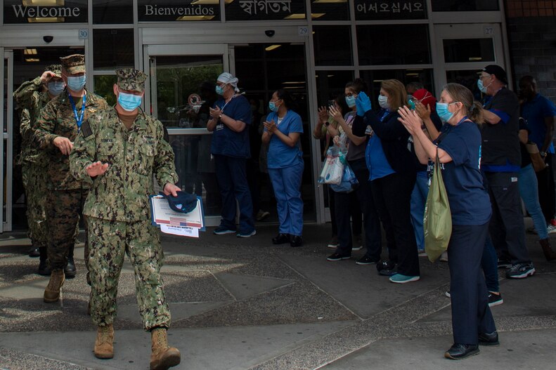 200603-N-HT995-0112 NEW YORK (June 3, 2020) Sailors assigned to the Navy Medicine Support Team are thanked by medical staff during a farewell ceremony at Elmhurst Medical Center, in Brooklyn, N.Y., June 3, 2020. Military medical providers assigned to the hospital collaborate as an integrated system in support of the New York City medical system, as part of the Department of Defense COVID-19 response. U.S. Northern Command, through U.S. Army North, remains committed to providing flexible Department of Defense support to the Federal Emergency Management Agency for the whole-of-nation COVID-19 response. (U.S. Navy photo by Mass Communication Specialist 3rd Class Omar Rubi/Released)