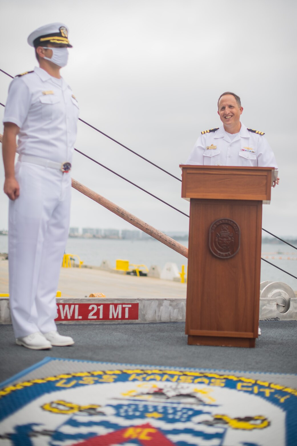 200620-N-VN584-1026 SAN DIEGO (June 20, 2020) Cmdr. R.J. Zamberlan, the commanding officer of the Navy's newest littoral combat ship, USS Kansas City (LCS 22), reads his orders during the ship�s commissioning ceremony. The Navy commissioned LCS 22, the second ship in naval history to be named Kansas City, via naval message due to public health safety and restrictions of large public events related to the novel coronavirus (COVID-19) pandemic. Kansas City is homeported at Naval Base San Diego. (U.S. Navy photo by Mass Communication Specialist 2nd Class Alex Corona/Released)