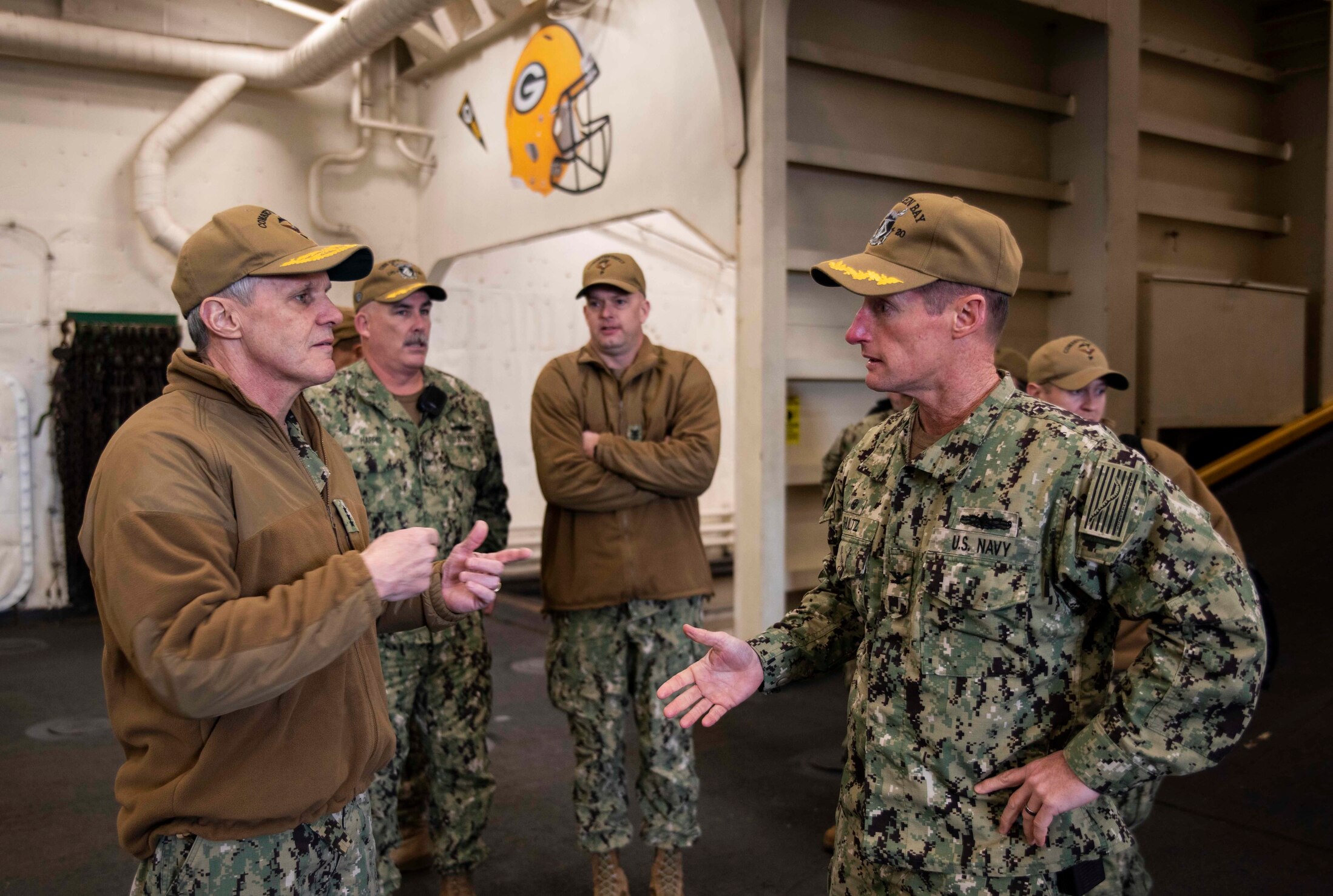 190109-N-DX072-1140 SASEBO, Japan (Jan. 9, 2019) Vice Adm. Phil Sawyer, commander of U.S. 7th Fleet, visits the crew of the amphibious transport dock ship USS Green Bay (LPD 20) during a waterfront visit to forward deployed naval forces operating out of Fleet Activities Sasebo, Japan. Sawyer and Master Chief Tobi Howat, U.S. 7th Fleet top enlisted Sailor, made the visit to Sasebo to thank the crews for their hard work as well as hear directly from the crews operating in the 7th Fleet. (U.S. Navy photo by Mass Communication Specialist Anaid Banuelos Rodriguez/Released)
