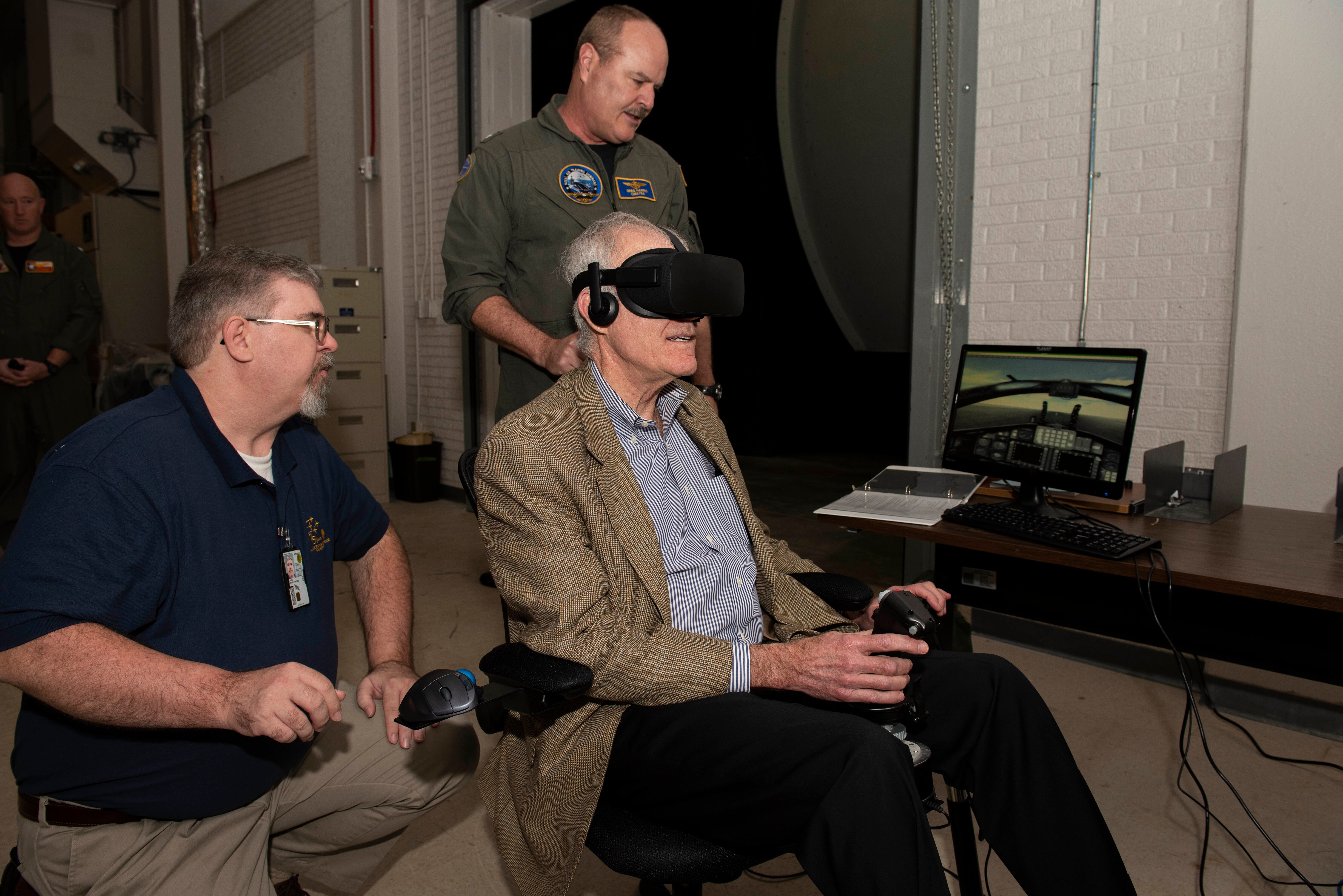 190110-N-OT909-026 KINGSVILLE, Texas (Jan. 10, 2019) Secretary of the Navy Richard V. Spencer tests a virtual reality simulator with the help of Rear Admiral Greg Harris, chief of naval air training, and Michael Oliver, in-service engineer for Naval Air Warfare Center Training Systems Division during a visit at Naval Air Station Kingsville, Jan. 10, 2019. Micro-simulators are a highly accessible way for flight students to self-study at any time or location, giving them an immersive study experience and the opportunity to prepare for future missions in advance, therefore improving the mission's quality when flown. (U.S. Navy photo by Anne Owens/Released)