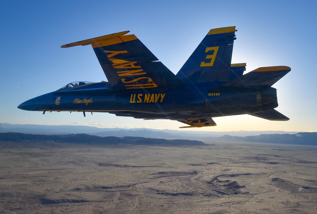 190206-N-OY339-1161 EL CENTRO, Calif. (Feb. 7, 2019) Lt. James Cox, left wing pilot for the U.S. Navy Flight Demonstration Squadron, the Blue Angels, flies over Imperial Valley during a training flight. The Blue Angels are conducting winter training at Naval Air Facility El Centro, California, in preparation for the 2019 show season. The team is scheduled to conduct 61 flight demonstrations at 32 locations across the country to showcase the pride and professionalism of the U.S. Navy and Marine Corps to the American public in 2019. (U.S. Navy photo by Mass Communication Specialist 2nd Class Christopher Gordon/Released)