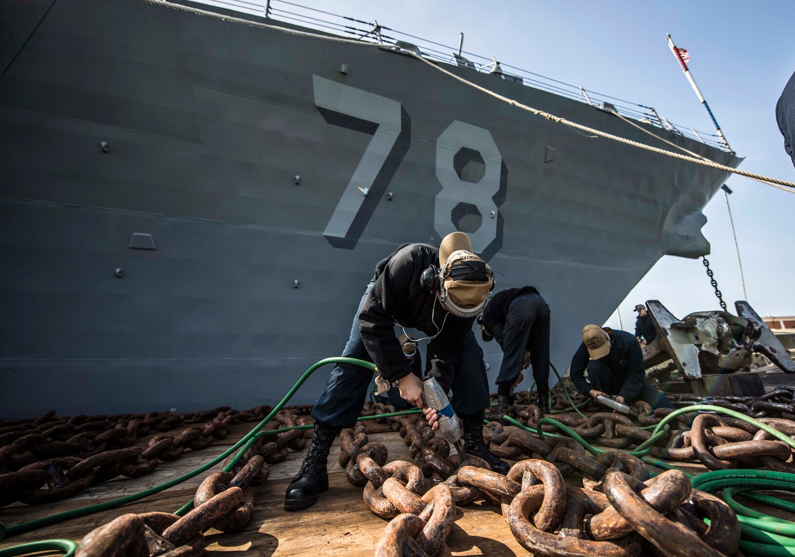 190223-N-KA046-0106 ROTA, SPAIN (Feb. 23, 2019) Sailors use needle guns to remove rust from the anchor chain of the Arleigh Burke-class guided-missile destroyer USS Porter (DDG 78) at Naval Station Rota, Spain, Feb. 23, 2019. Porter, forward-deployed to Rota, Spain, is on its sixth patrol in the U.S. 6th Fleet area of operations in support of U.S national security interests in Europe and Africa. (U.S. Navy photo by Mass Communication Specialist 2nd Class James R. Turner/Released)