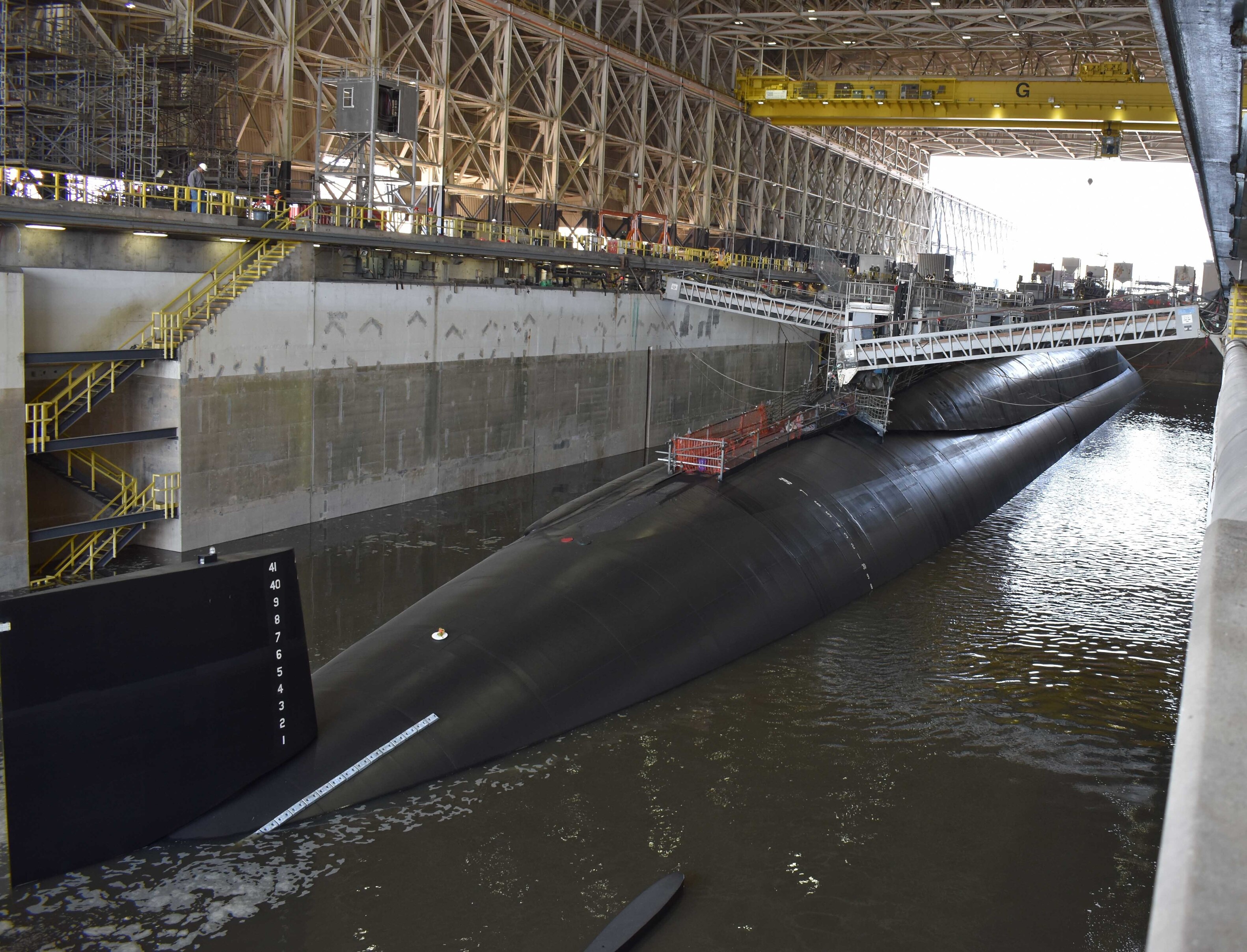 190322-N-KG413-0021 KINGS BAY, Ga. (March 22, 2019) The Ohio-class guided missile submarine USS Georgia (SSGN 729) prepares to exit the dry dock at Naval Submarine Base Kings Bay, Georgia, following an extended refit period. Georgia is one of two guided missile submarines stationed at the base and is capable of carrying up to 154 Tomahawk Land Attack Missiles. (U.S. Navy photo by Mass Communication Specialist 2nd Class Bryan Tomforde/Released)