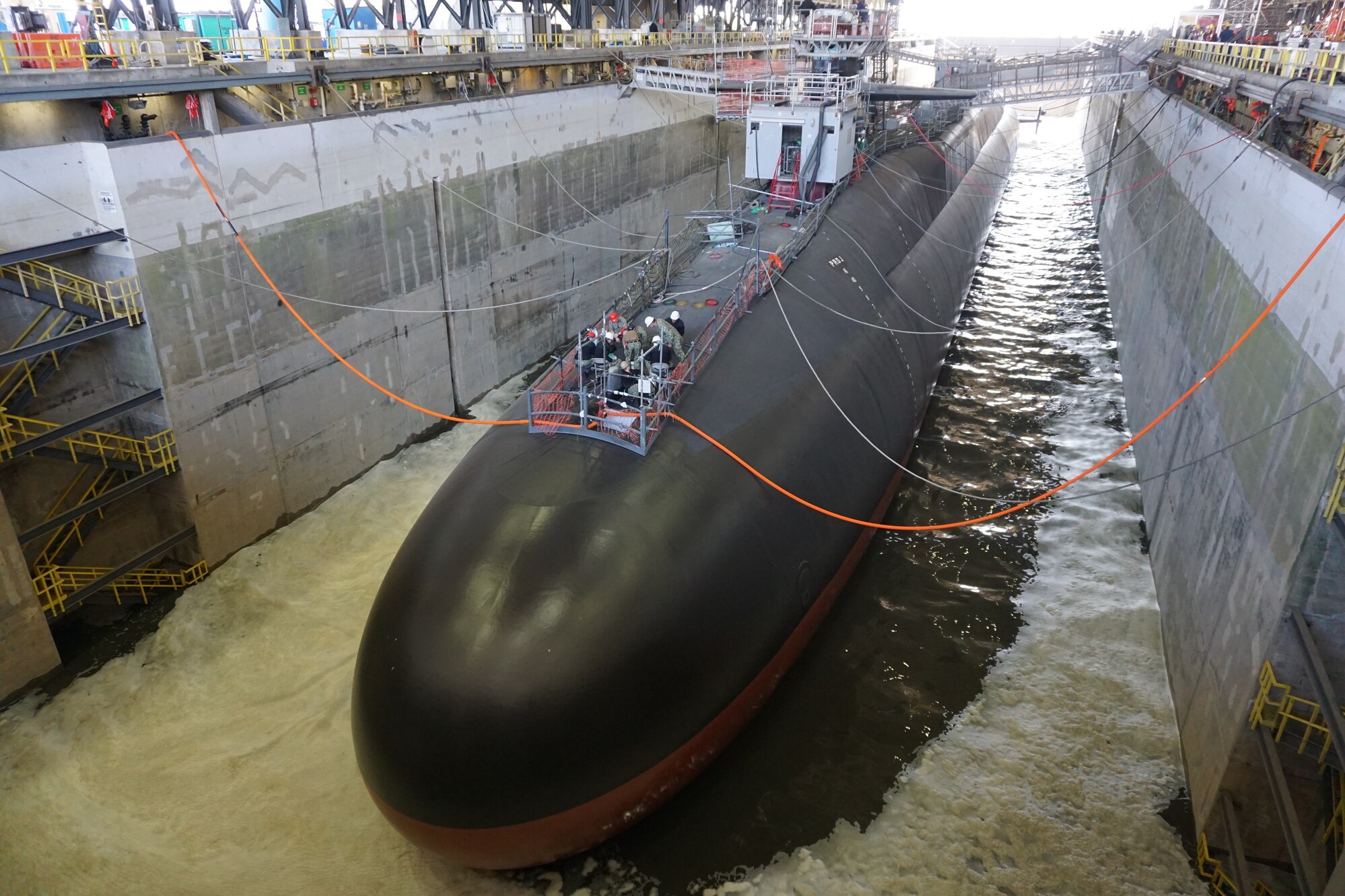 190322-N-KG413-0030 KINGS BAY, Ga. (March 22, 2019) The Ohio-class guided missile submarine USS Georgia (SSGN 729) prepares to exit the dry dock at Naval Submarine Base Kings Bay, Georgia, following an extended refit period. Georgia is one of two guided missile submarines stationed at the base and is capable of carrying up to 154 Tomahawk Land Attack Missiles. (U.S. Navy photo by Mass Communication Specialist 2nd Class Bryan Tomforde/Released)
