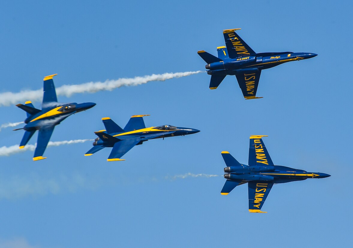 190323-N-UK306-1721 SALINAS, Calif. (March 23, 2019) The U.S. Navy flight demonstration squadron, the Blue Angels, diamond pilots perform the low break cross maneuver during a demonstration at the California International Airshow at the Salinas Municipal Airport. The team is scheduled to conduct 61 flight demonstrations at 32 locations across the country to showcase the pride and professionalism of the U.S. Navy and Marine Corps to the American public in 2019. (U.S. Navy photo by Mass Communication Specialist 2nd Class Timothy Schumaker/Released)