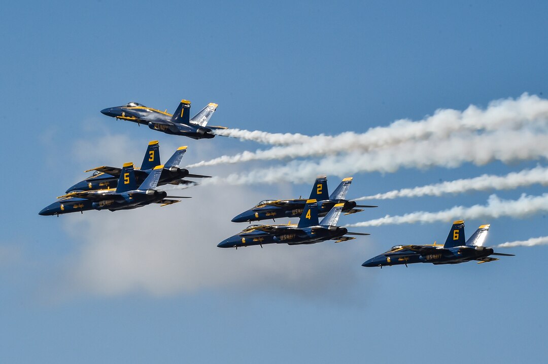 190323-N-UK306-1926 SALINAS, Calif. (March 23, 2019) The U.S. Navy flight demonstration squadron, the Blue Angels, perform the Pitch Up Break maneuver during a demonstration at the California International Airshow at the Salinas Municipal Airport. The team is scheduled to conduct 61 flight demonstrations at 32 locations across the country to showcase the pride and professionalism of the U.S. Navy and Marine Corps to the American public in 2019. (U.S. Navy photo by Mass Communication Specialist 2nd Class Timothy Schumaker/Released)