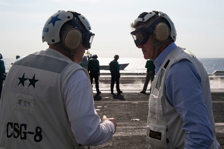 190408-N-UJ486-0419 ATLANTIC OCEAN (Apr. 8, 2019) Commander, Carrier Strike Group Eight, Rear Admiral Gene Black, left, and Sen. David Perdue observe flight operations aboard the Nimitz-class aircraft carrier USS Harry S. Truman (CVN 75). Truman is participating in a sustainment exercise (SUSTEX) with the Harry S. Truman Carrier Strike Group (HSTCSG), an integrated, comprehensive exercise designed to ensure HSTCSG is ready to meet all mission sets and carry out sustained combat operations from the sea. (U.S. Navy photo by Mass Communication Specialist 3rd Class Rebekah A. Watkins/Released)