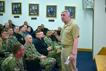190410-N-CB398-097 NEWPORT, R.I. (April 10, 2019) Rear Adm. Gregory Todd, deputy chief of chaplains, speaks to students of U.S. Navy Senior Enlisted Academy, class 222, about the role of the chaplain corps in the military, how senior enlisted leaders can utilize chaplain services and when they should consider sending their Sailors to religious ministries for guidance. (U.S. Navy photo by Mass Communication Specialist 2nd Class Zachary Allan/Released)