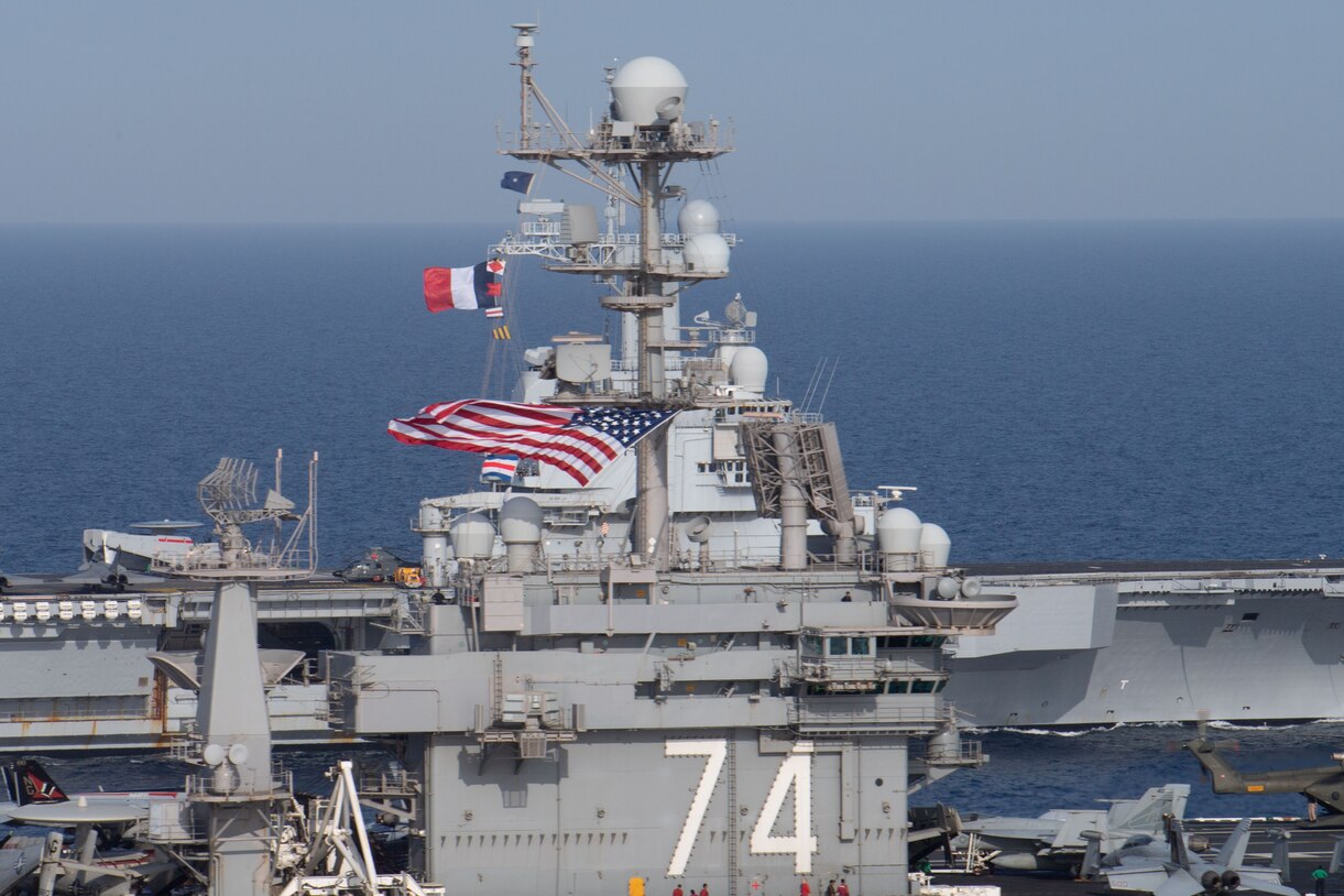 190415-N-IL409-0010 RED SEA (April 15, 2019) The French Marine Nationale aircraft carrier FS Charles De Gaulle (R91), and the aircraft carrier USS John C. Stennis (CVN 74) are underway in formation in the Red Sea, April 15, 2019. The John C. Stennis Carrier Strike Group is deployed to the U.S. 5th Fleet area of operations in support of naval operations to ensure maritime stability and security in the Central Region, connecting the Mediterranean and the Pacific through the western Indian Ocean and three strategic choke points. (U.S. Navy photo by Mass Communication Specialist Seaman Joshua L. Leonard/Released)