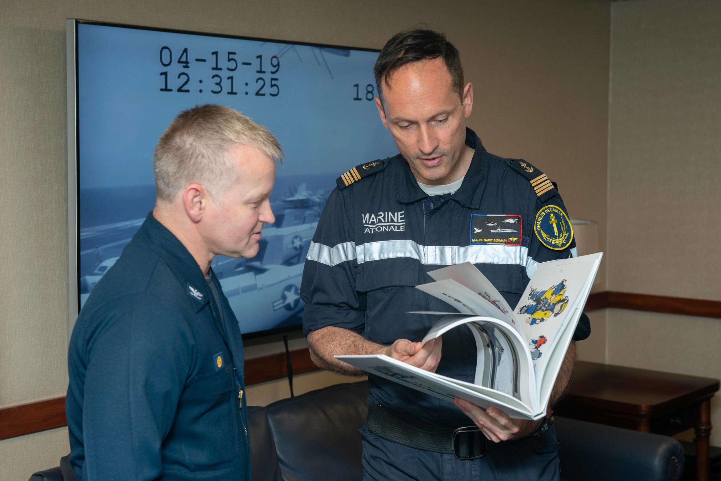 190415-N-QE928-1372 RED SEA (April 15, 2019) Capt. Marc-Antoine de Saint Germain, commanding officer of the French Marine Nationale aircraft carrier FS Charles de Gaulle (F 91) presents a gift to Capt. Randy Peck, commanding officer of the aircraft carrier USS John C. Stennis (CVN 74), in the Flag Mess aboard the John C. Stennis in the Red Sea, April 15, 2019. The John C. Stennis Carrier Strike Group is deployed to the U.S. 5th Fleet area of operations in support of naval operations to ensure maritime stability and security in the Central Region, connecting the Mediterranean and the Pacific through the western Indian Ocean and three strategic choke points. (U.S. Navy photo by Mass Communication Specialist 2nd Class Erika L. Kugler/Released)