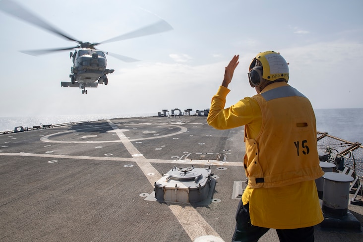 190415-N-RG171-1098 RED SEA (April 15, 2019) Boatswain's Mate 2nd Class Youssef Belakbir guides an NH 90 Caiman helicopter from the French Marine Nationale aircraft carrier FS Charles De Galle (F 91) onto the flight deck of the Arleigh Burke-class guided-missile destroyer USS McFaul (DDG 74), April 15, 2019. McFaul is deployed to the U.S. 5th Fleet area of operations in support of naval operations to ensure maritime stability and security in the Central Region, connecting the Mediterranean and the Pacific through the western Indian Ocean and three strategic choke points. (U.S. Navy photo by Mass Communication Specialist 3rd Class Will Hardy/Released)