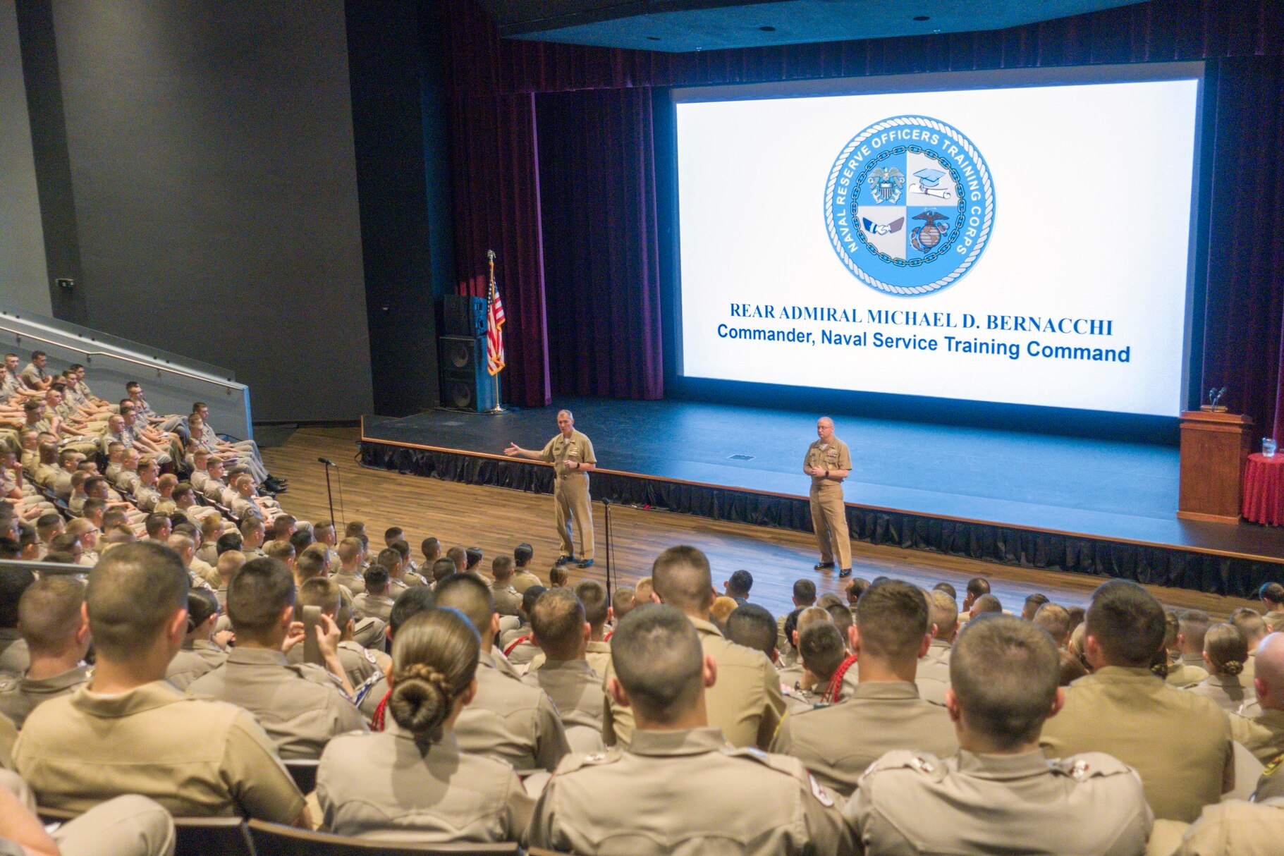 190416-N-LX437-1166 COLLEGE STATION, Texas (April 16, 2019) Rear Adm. Mike Bernacchi, commander of Naval Service Training Command (NSTC), and Master Chief Petty Officer Jimmy Hailey III, NSTC command master chief, speak to Texas A&M Naval ROTC midshipmen during an admiral’s call. NROTC units report to NSTC, and visits such as this allow for midshipmen professional development and allow Bernacchi to speak directly with midshipmen, staff, and university leaders. (U.S. Navy photo by Lt. Cmdr. Frederick Martin/Released)