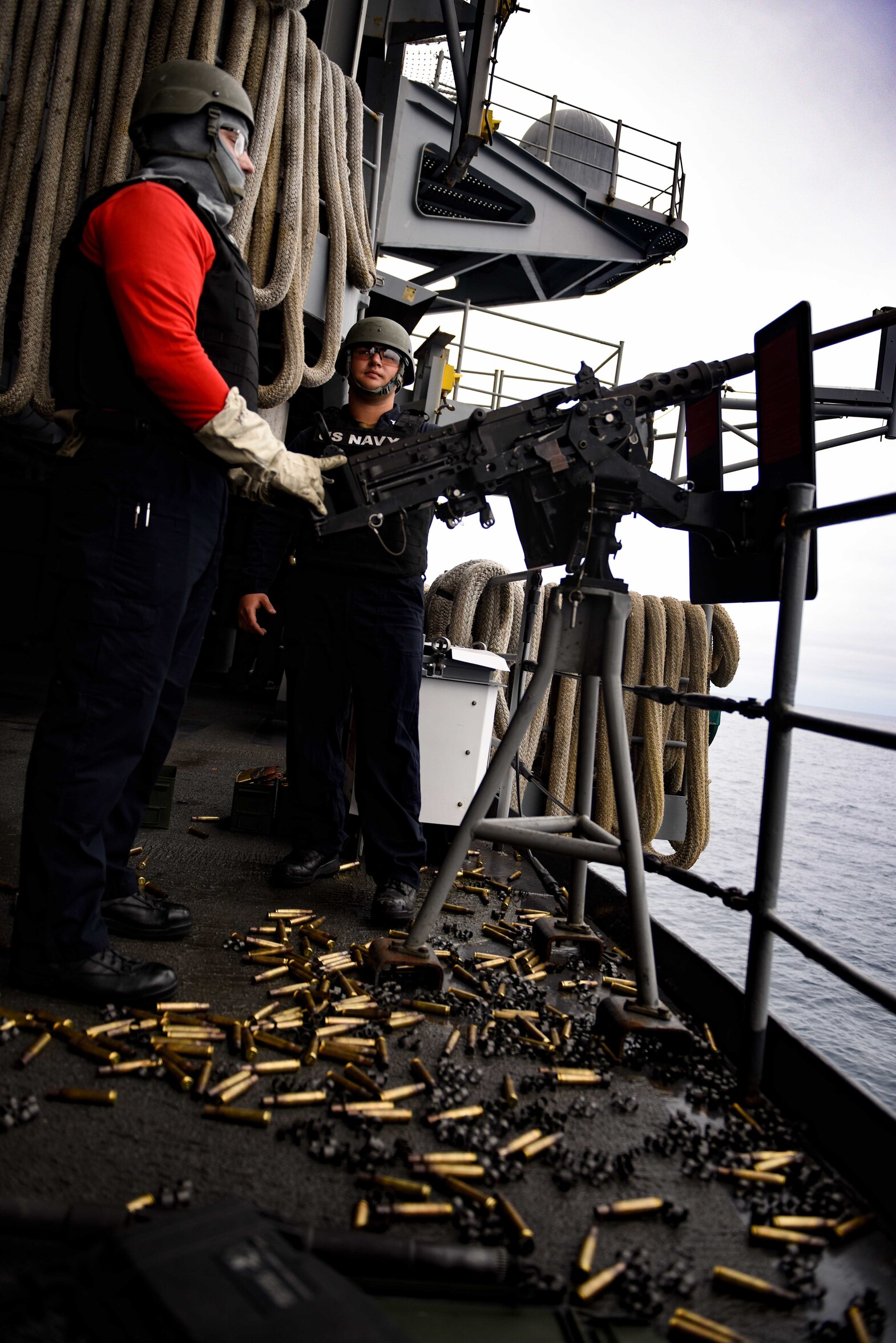 190427-N-ZM949-1031 PACIFIC OCEAN (April 27, 2019) Aviation Ordinanceman 3rd Class Kameron Ganger, from Hillsboro, Mo., left, and Gunner’s Mate 2nd Class Joshua Jenkins, from Clearwater, La., await orders to fire a .50-caliber machine gun during a live-fire qualification course on the fantail of the aircraft carrier USS Theodore Roosevelt (CVN 71). Theodore Roosevelt is conducting routine operations in the Eastern Pacific. (U.S. Navy photo by Mass Communication Specialist 3rd Class Erick A. Parsons/Released)