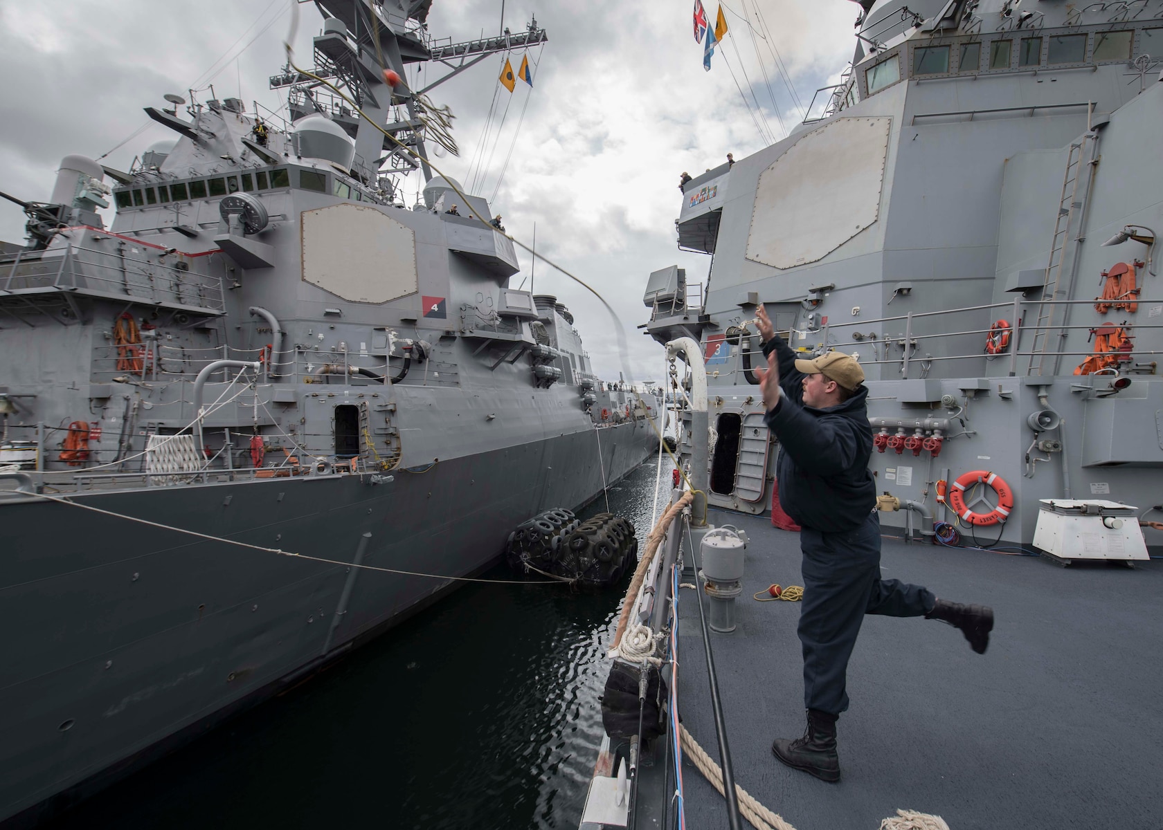 190506-N-TI693-0101 FASLANE, Scotland (May 6, 2019) Boatswain’s Mate Seaman Timothy Mallon, from Philadelphia, assigned to the Arleigh Burke-class guided-missile destroyer USS Carney (DDG 64), throws a heaving line to USS Roosevelt (DDG 80) as Carney moors in Faslane, Scotland, May 6, 2019. Carney, forward-deployed to Rota, Spain, is on its sixth patrol in the U.S. 6th Fleet area of operations in support of regional allies and partners as well as U.S. national security interests in Europe and Africa. (U.S. Navy photo by Mass Communication Specialist 1st Class Fred Gray IV/Released)