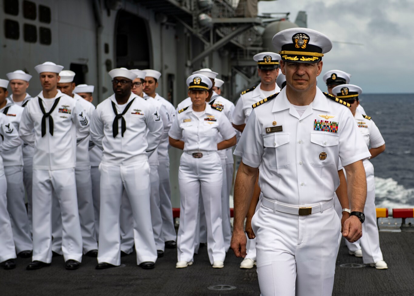 190507-N-EZ002-1092 PACIFIC OCEAN (May 7, 2019) Capt. Ronald Dowdell, commanding officer of the amphibious assault ship USS Boxer (LHD 4), participates in a burial at sea ceremony on the ship’s starboard elevator. Sailors and Marines of the Boxer Amphibious Ready Group (ARG) and 11th Marine Expeditionary Unit (MEU) are embarked aboard Boxer on a scheduled deployment. (U.S. Navy photo by Mass Communication Specialist 3rd Class Keypher Strombeck/Released)