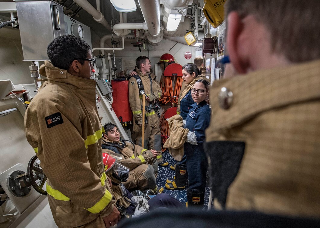 190518-N-TI693-0042 ATLANTIC OCEAN (May 18, 2019) Sailors assigned to the Arleigh Burke-class guided-missile destroyer USS Carney (DDG 64) stand by at their repair locker during a general quarters drill, May 18, 2019. Carney, forward-deployed to Rota, Spain, is on its sixth patrol in the U.S. 6th Fleet area of operations in support of regional allies and partners as well as U.S. national security interests in Europe and Africa. (U.S. Navy photo by Mass Communication Specialist 1st Class Fred Gray IV/Released)