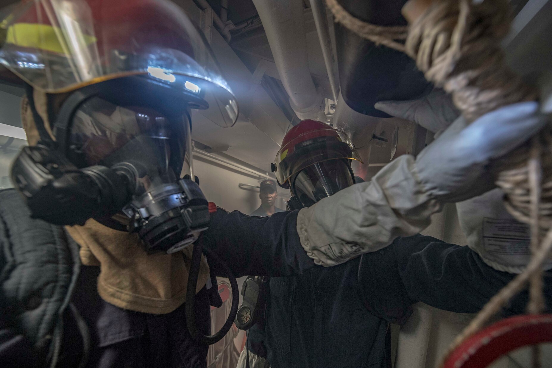 190518-N-TI693-0188 ATLANTIC OCEAN (May 18, 2019) Gas Turbine Systems Technician (Mechanical) 3rd Class Dayvd Harris, left, from Clayton, North Carolina, and Machinist’s Mate Seaman Akinola Ogunmuko, from Canton, Georgia, place a soft patch over a simulated pipe rupture during a general quarters drill aboard the Arleigh Burke-class guided-missile destroyer USS Carney (DDG 64), May 18, 2019. Carney, forward-deployed to Rota, Spain, is on its sixth patrol in the U.S. 6th Fleet area of operations in support of regional allies and partners as well as U.S. national security interests in Europe and Africa. (U.S. Navy photo by Mass Communication Specialist 1st Class Fred Gray IV/Released)