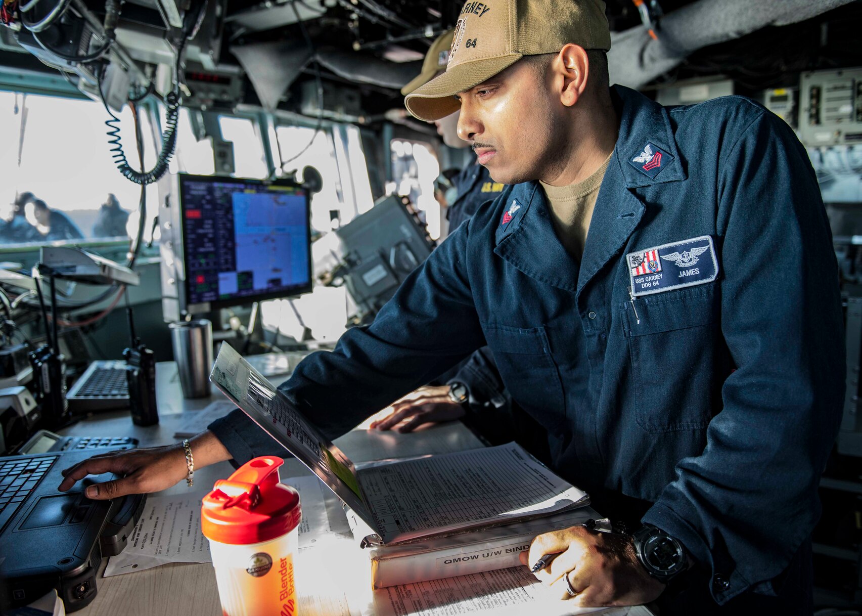 190521-N-TI693-0010 ATLANTIC OCEAN (May 21, 2019) Personnel Specialist 1st Class Nigel James stands watch on the bridge as the deck log recorder aboard the Arleigh Burke-class guided-missile destroyer USS Carney (DDG 64), May 21, 2019. Carney, forward-deployed to Rota, Spain, is on its sixth patrol in the U.S. 6th Fleet area of operations in support of regional allies and partners as well as U.S. national security interests in Europe and Africa. (U.S. Navy photo by Mass Communication Specialist 1st Class Fred Gray IV/Released)