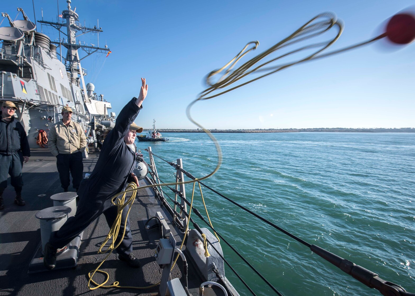 190521-N-TI693-0041 ROTA, Spain (May 21, 2019) Gunner’s Mate Seaman Allie Kay, from Pensacola, Florida, throws a heaving ball to a tugboat along side the Arleigh Burke-class guided-missile destroyer USS Carney (DDG 64), May 21, 2019. Carney, forward-deployed to Rota, Spain, is on its sixth patrol in the U.S. 6th Fleet area of operations in support of regional allies and partners as well as U.S. national security interests in Europe and Africa. (U.S. Navy photo by Mass Communication Specialist 1st Class Fred Gray IV/Released)