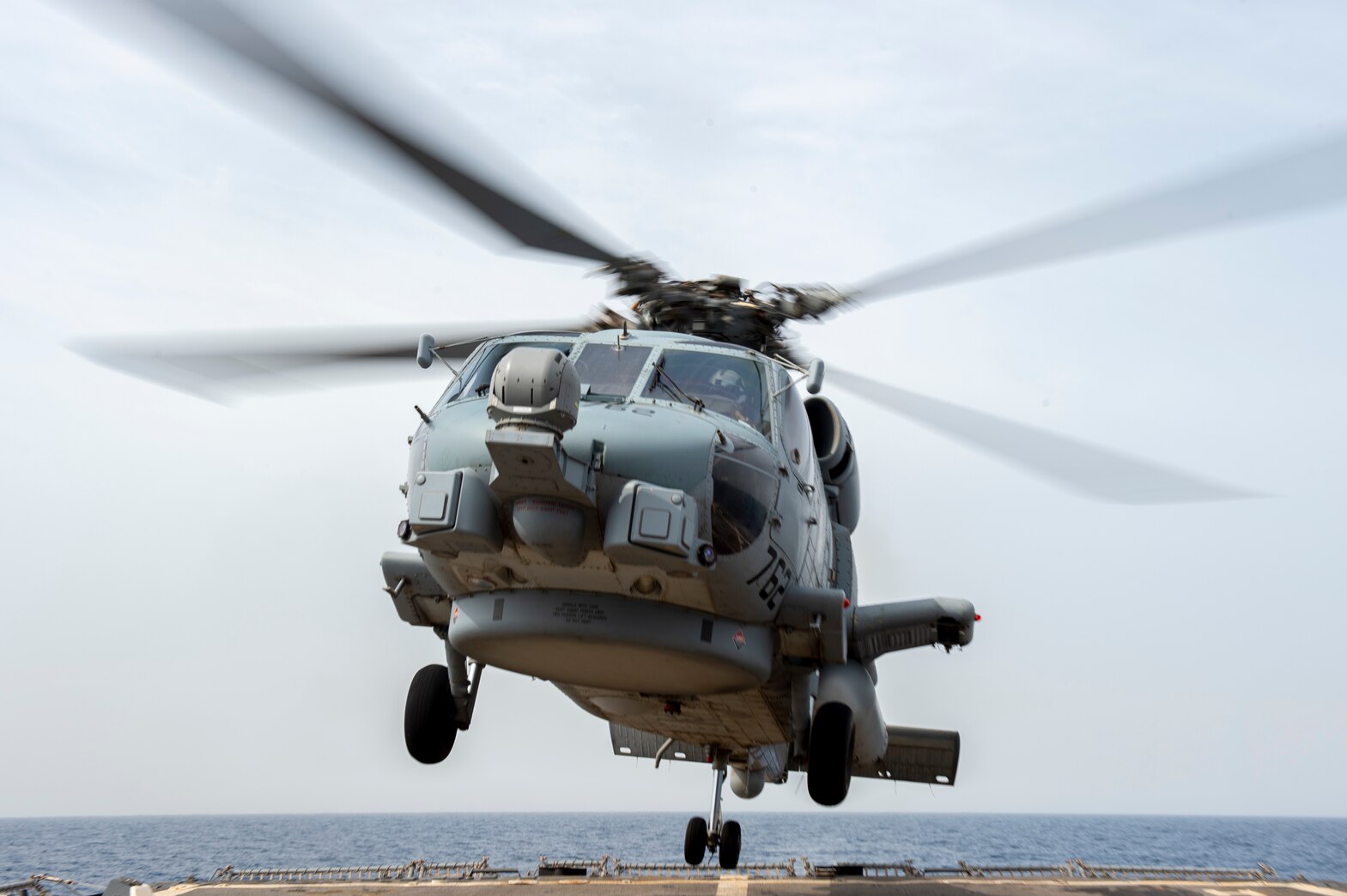 190531-N-UM706-0089 RED SEA (May 31, 2019) An MH-60R Sea Hawk helicopter assigned to the “Grandmasters” of Helicopter Maritime Strike Squadron (HSM) 46 takes off from the flight deck aboard the Arleigh Burke-class guided-missile destroyer USS Nitze (DDG 94). Nitze is deployed to the U.S. 5th Fleet areas of operations in support of naval operations to ensure maritime stability and security in the Central Region, connecting the Mediterranean and Pacific through the Western Indian Ocean and three strategic choke points. (U.S. Navy photo by Mass Communication Specialist Seaman Madysson Anne Ritter/Released)
