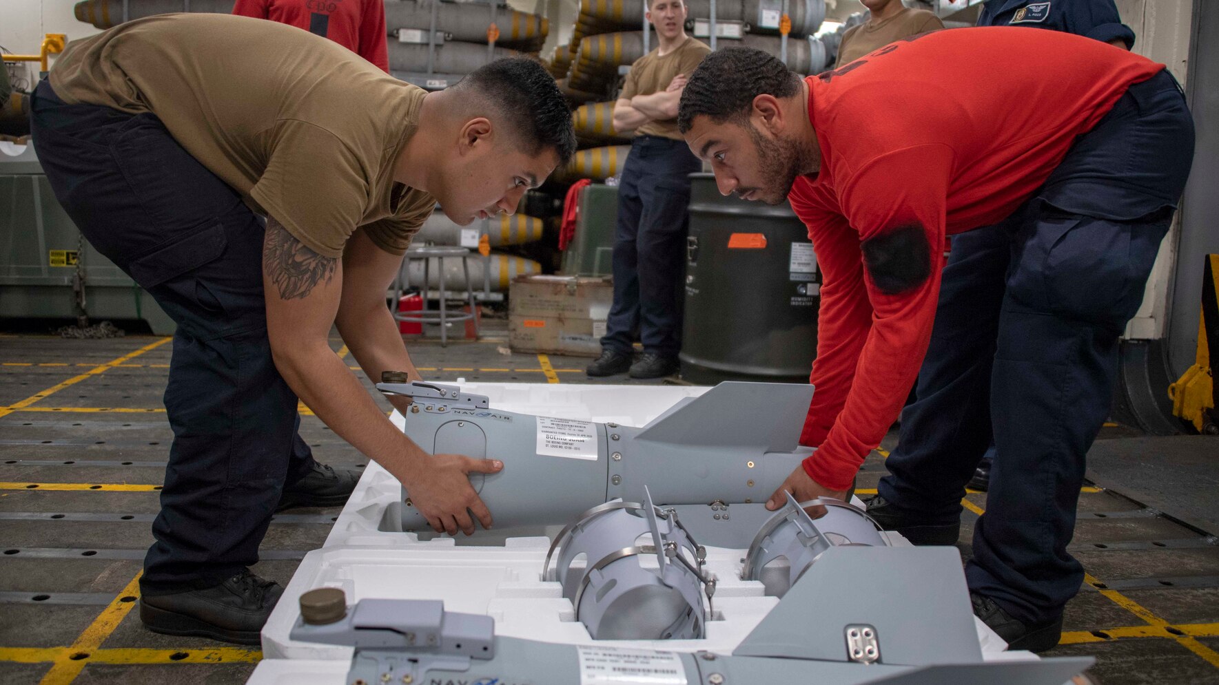 190628-N-NG710-1100 GULF OF ADEN (June 28, 2019) Aviation Ordnanceman Airman Cleo Seabreak, left, from Corpus Christi, Texas, and Aviation Ordnanceman Airman Darian Hubisz, from Lamarque, Texas, move the fan assembly of a guided bomb unit aboard the amphibious assault ship USS Boxer (LHD 4). Boxer is part of the Boxer Amphibious Ready Group and 11th Marine Expeditionary Unit and is deployed to the U.S. 5th Fleet area of operations in support of naval operations to ensure maritime stability and security in the Central Region, connecting the Mediterranean and the Pacific through the Western Indian Ocean and three strategic choke points. (U.S. Navy photo by Mass Communication Specialist 2nd Class Justin D. Rankin/Released)