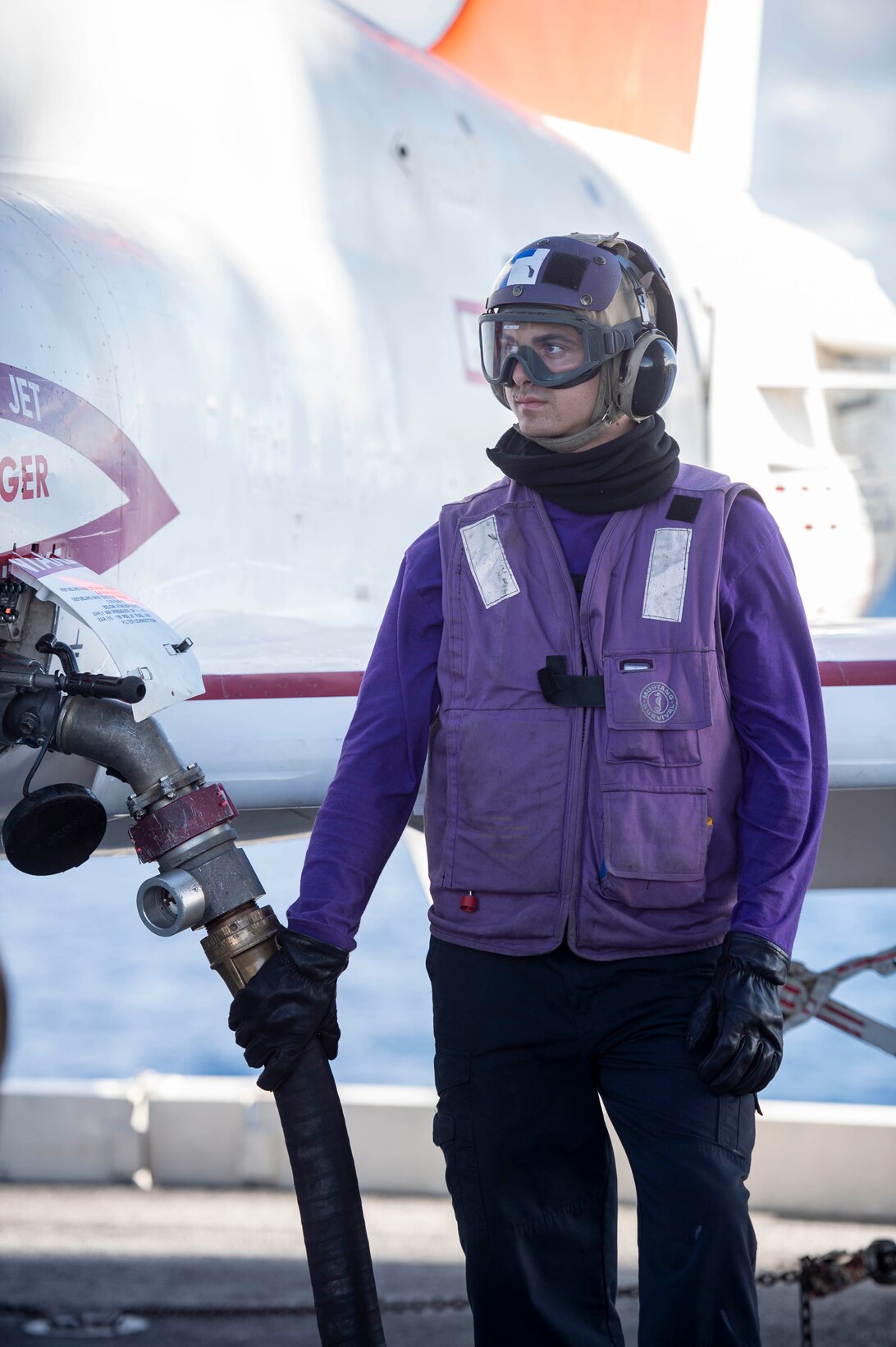 190715-N-EE423-0299 ATLANTIC OCEAN (July 15, 2019) Airman Devin Harney, from Wimberley, Texas, refuels a T-45C Goshawk training aircraft, assigned to Training Air Wing (TW) 1, aboard the aircraft carrier USS Dwight D. Eisenhower (CVN 69). Ike is underway in the Atlantic Ocean conducting carrier qualifications while in the basic phase of the Optimized Fleet Response Plan. (U.S. Navy photo by Mass Communication Specialist 3rd Class Sophie A. Pinkham/Released)