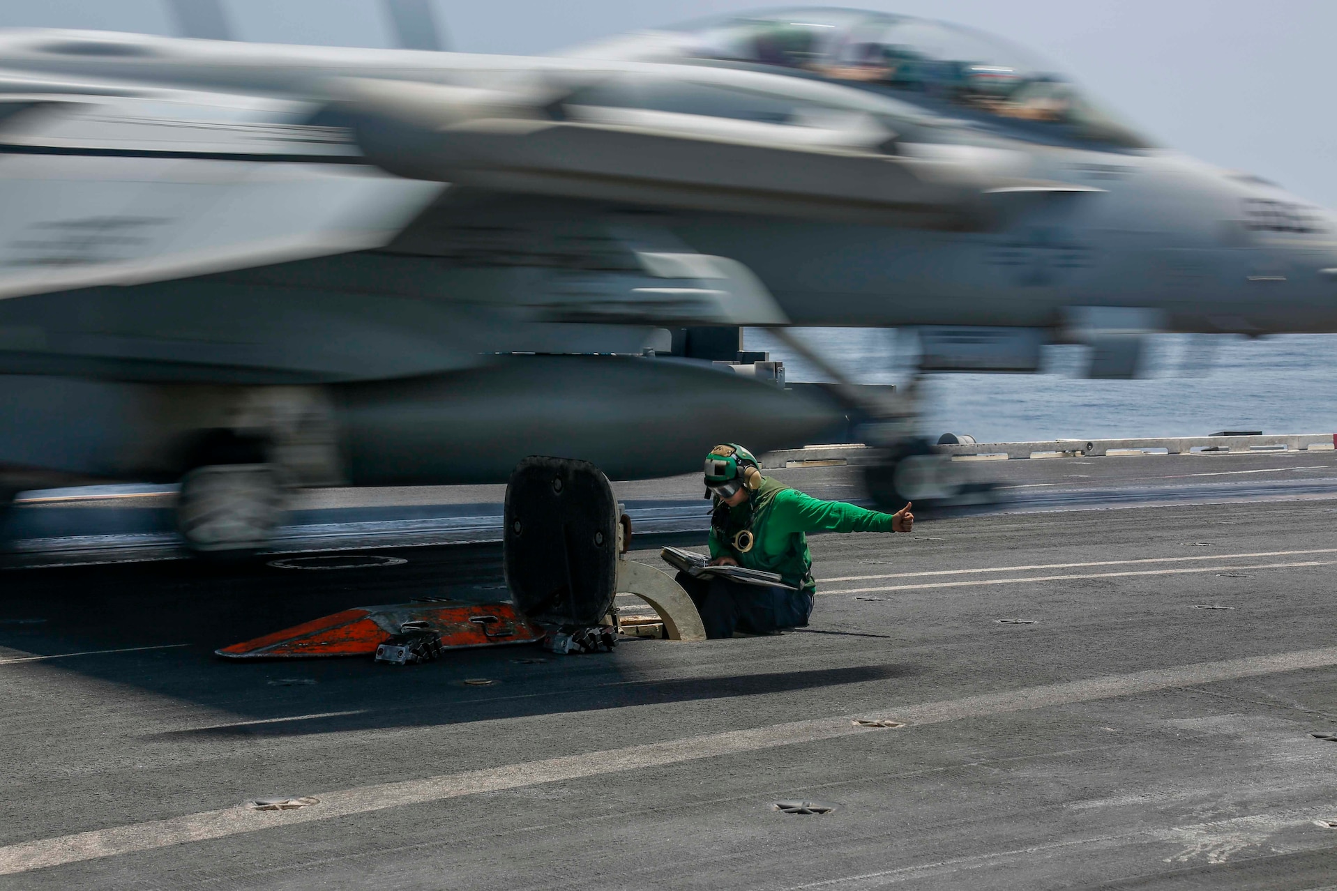 190827-N-MM912-1057 ARABIAN SEA (Aug. 27, 2019) Aviation Boatswain's Mate (Equipment) Airman Francisco Romero operates a catapult as an EA-18G Growler attached to the "Patriots" of Electronic Attack Squadron (VAQ) 140 is launched off the flight deck of the aircraft carrier USS Abraham Lincoln (CVN 72). Abraham Lincoln Carrier Strike Group is deployed to the U.S. 5th Fleet area of operations in support of naval operations to ensure maritime stability and security in the Central Region, connecting the Mediterranean and the Pacific through the western Indian Ocean and three strategic choke points. With Abraham Lincoln as the flagship, deployed strike group assets include staffs, ships and aircraft of Carrier Strike Group 12 (CSG 12), Destroyer Squadron 2 (DESRON 2), USS Leyte Gulf (CG 55) and Carrier Air Wing 7 (CVW 7). (U.S. Navy photo by Mass Communication Specialist 3rd Class Michael Singley/Released)