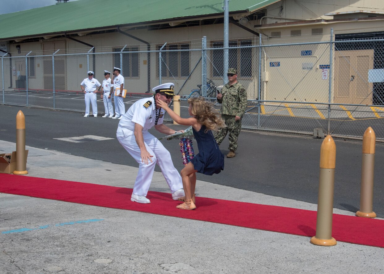 190908-N-UD469-0013 JOINT BASE PEARL HARBOR-HICKAM (Sept. 8, 2019) Cmdr. Benjamin Selph, commanding officer of the Los Angeles-class fast-attack submarine USS Olympia (SSN 717), is greeted by his family during Olympia's homecoming. Olympia returned from a seven-month, around-the-world deployment in support of maritime security operations with allies and partners to ensure high-end war fighting capabilities in this era of great power competition. (U.S. Navy photo by Mass Communication Specialist 1st Class Amanda Gray/Released)