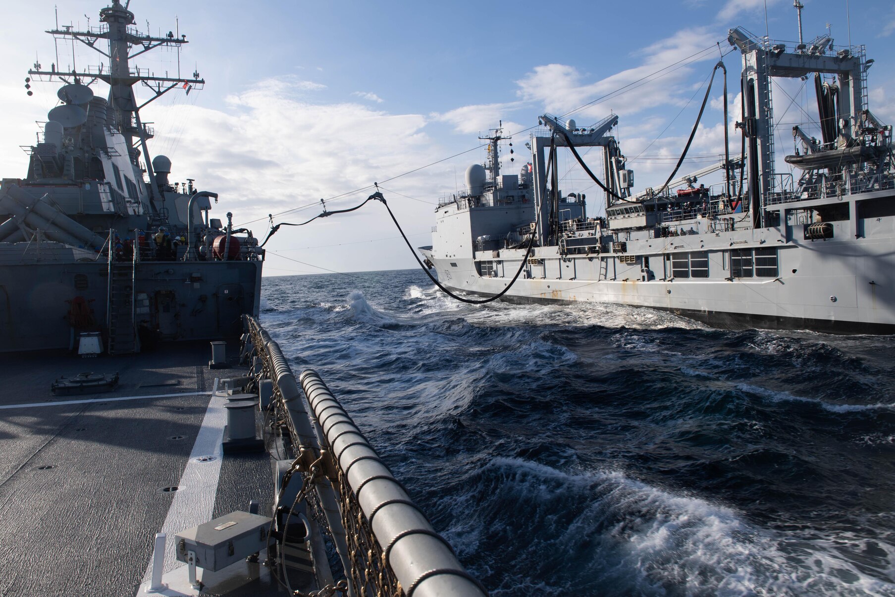 191127-N-CJ510-0121 MEDITERRANEAN SEA (Nov. 27, 2019) The Arleigh Burke-class guided-missile destroyer USS Ross (DDG 71) participates in a replenishment-at-sea with the French Durance class command and replenishment ship FS Somme (A631), Nov. 27, 2019. Ross, forward-deployed to Rota, Spain, completed its ninth patrol in the U.S. 6th Fleet area of operations in support of U.S. national security interests in Europe and Africa. (U.S. Navy photo by Mass Communication Specialist 3rd Class Andrea Rumple/Released)