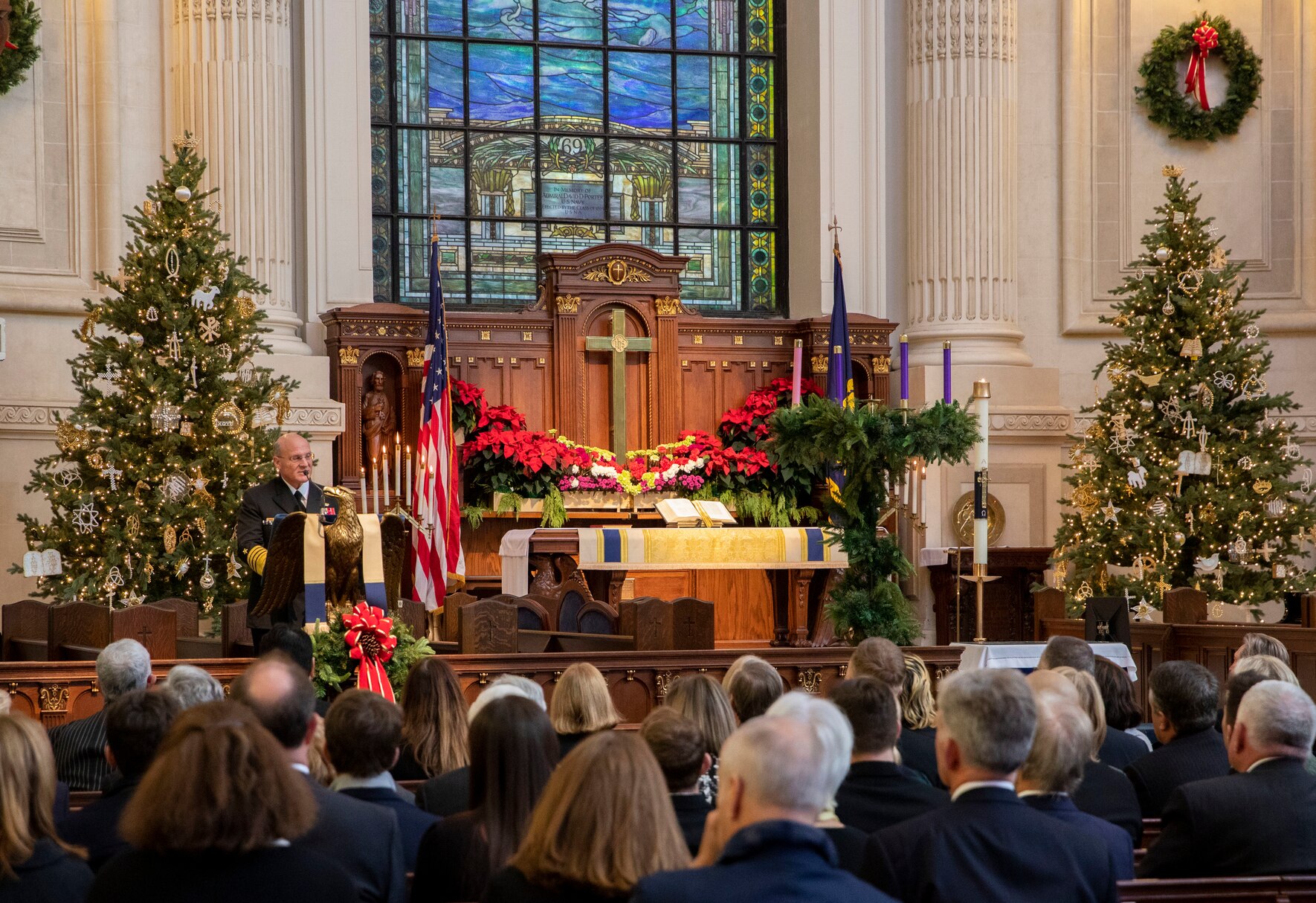 191218-N-TR763-0070 ANNAPOLIS, Md. (Dec. 18, 2019) Chief of Naval Operations (CNO) Adm. Mike Gilday delivers remarks at the funeral for retired Adm. James Holloway III, the 20th Chief of Naval Operations. Holloway was born Feb. 23, 1922, and served in the U.S. Navy for 36 years. He is survived by his wife, two daughters and one grandson. He was predeceased in 1964 by his son. (U.S. Navy photo by Chief Mass Communication Specialist Nick Brown/Released)