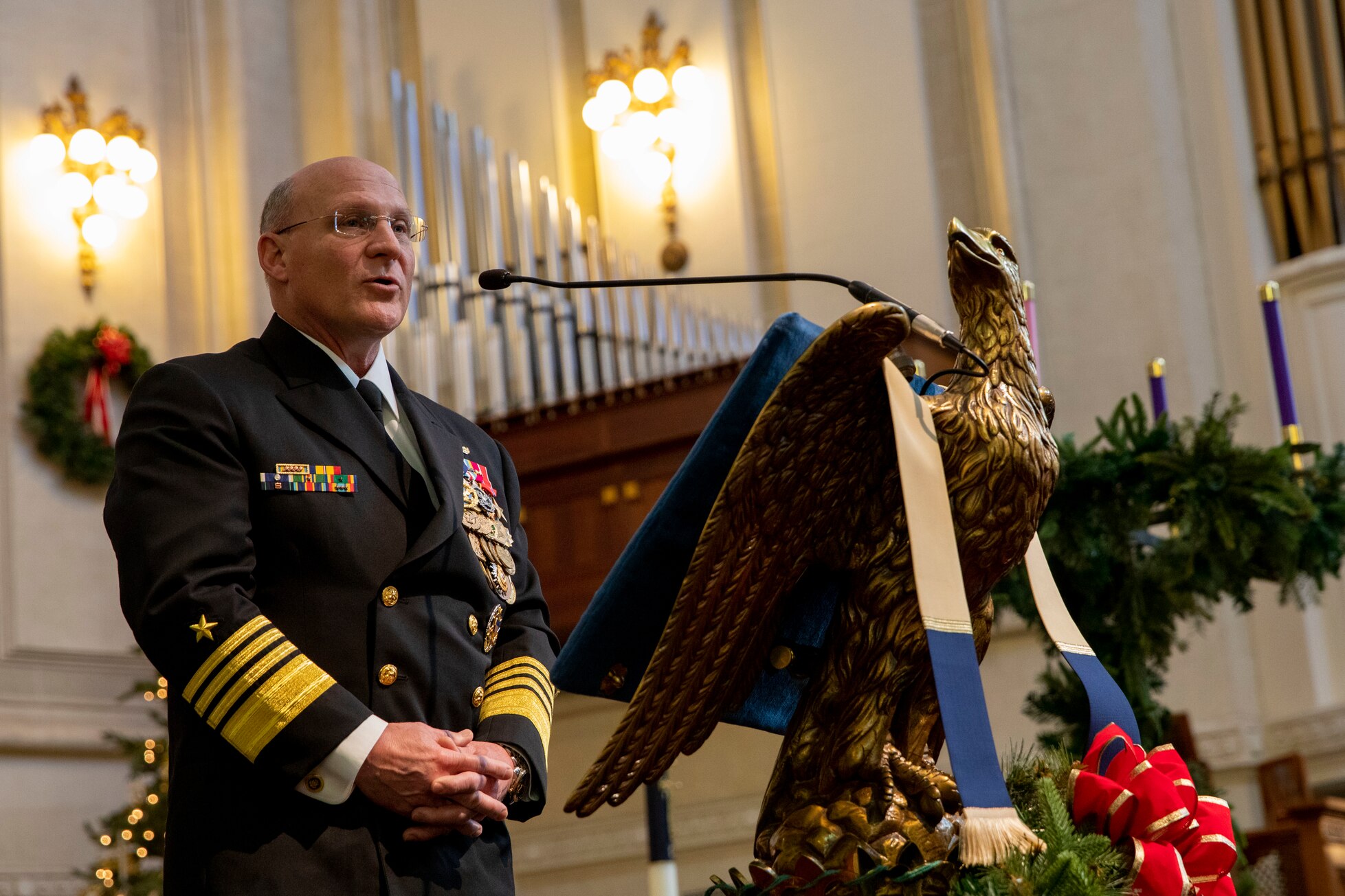 191218-N-TR763-0081 ANNAPOLIS, Md. (Dec. 18, 2019) Chief of Naval Operations (CNO) Adm. Mike Gilday delivers remarks at the funeral for retired Adm. James Holloway III, the 20th Chief of Naval Operations. Holloway was born Feb. 23, 1922, and served in the U.S. Navy for 36 years. He is survived by his wife, two daughters and one grandson. He was predeceased in 1964 by his son. (U.S. Navy photo by Chief Mass Communication Specialist Nick Brown/Released)