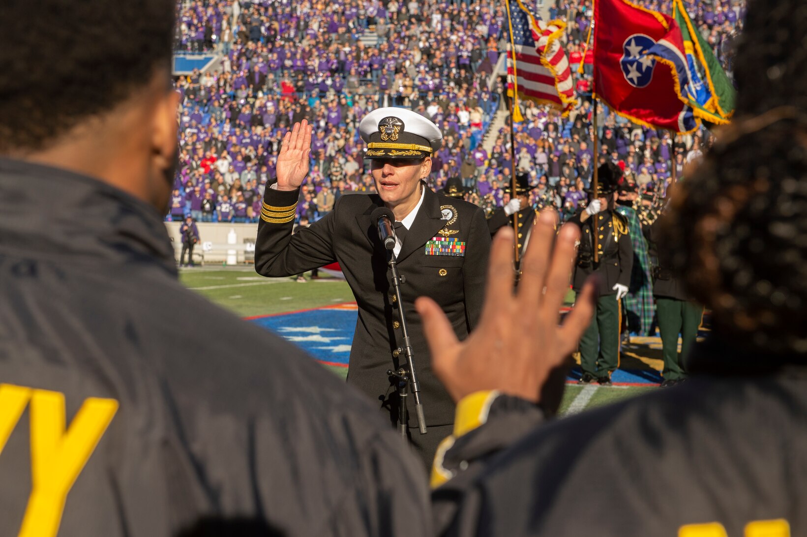 191231-N-FO865-0400 Memphis, Tenn. (Dec. 31, 2019) Cmdr. Lauren Majchrzak, executive officer of Navy Talent Acquisition Group, administers the oath of enlistment for 10 future Sailors on the field at Liberty Bowl Memorial Stadium. The AutoZone Liberty Bowl is a college football game played on New Year’s Eve in Memphis, and today the Navy Midshipmen play the Kansas State Wildcats. (U.S. Navy photo by Mass Communication Specialist 2nd Class Brandon Woods/Released)