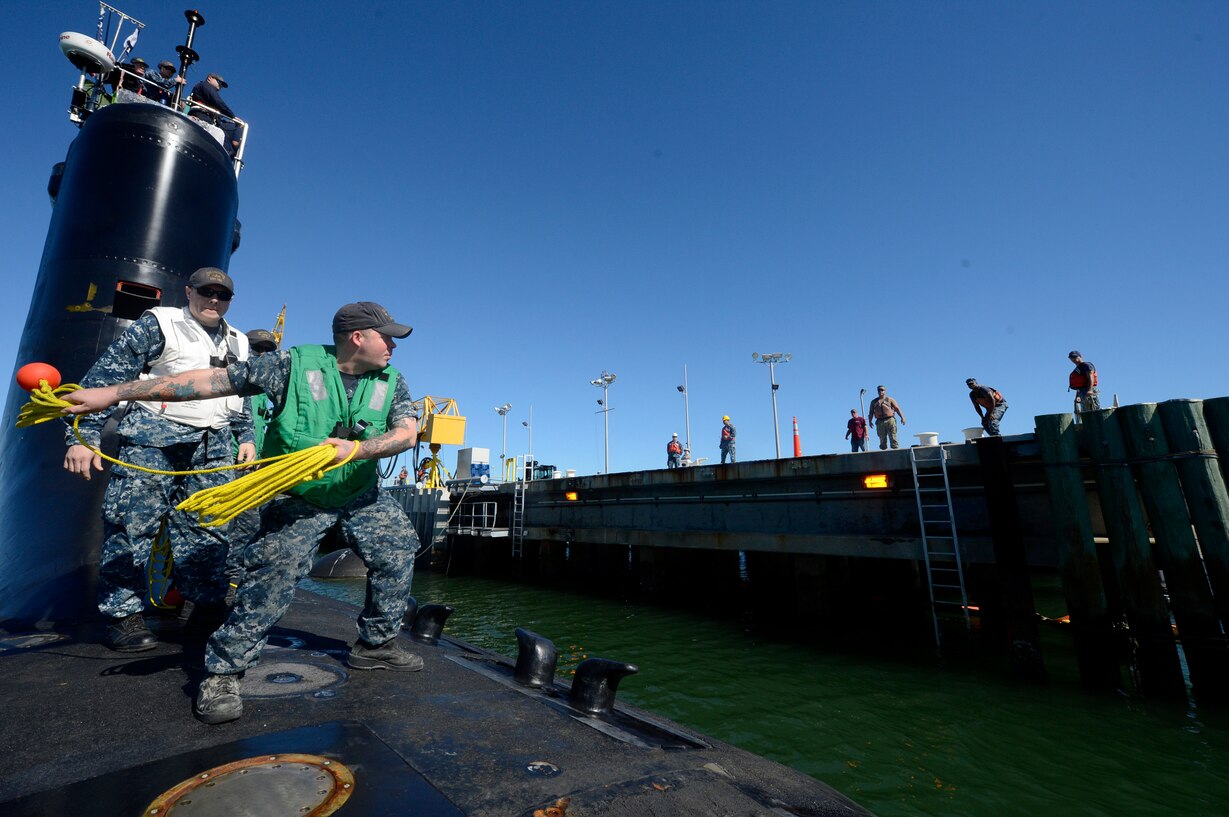180111-N-JE719-925 PORT CANAVERAL, Fla. (Jan. 11, 2018) Line handlers work to moor the Pre-Commissioning Unit Colorado (SSN 788). Colorado is the 15th Virginia-class attack submarine and is scheduled to be commissioned March 17, 2018. (U.S. Navy photo by Mass Communication Specialist 1st Class Jeffrey M. Richardson/Released)