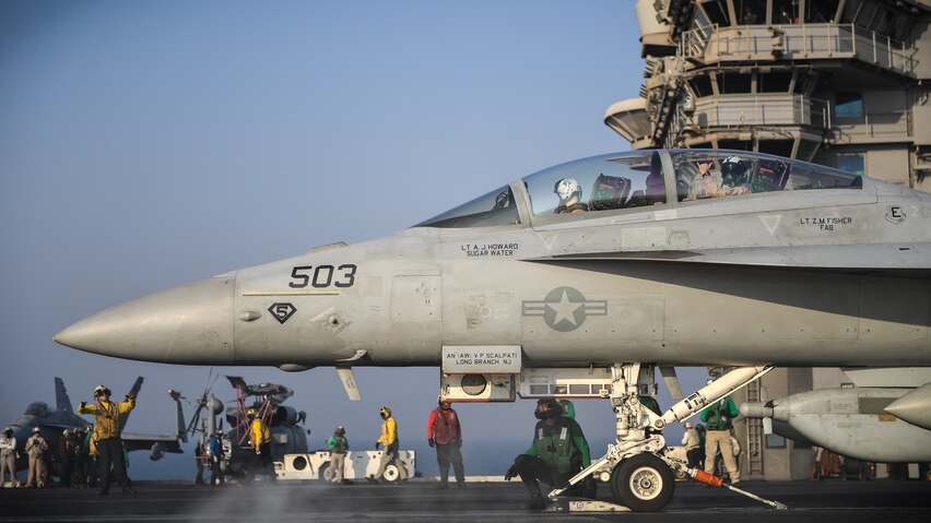 180208-N-MJ135-1141 ARABIAN GULF (Feb. 8, 2018) An EA-18G Growler, assigned to the Cougars of Electronic Attack Squadron (VAQ) 139 readies for launch from the flight deck of the aircraft carrier USS Theodore Roosevelt (CVN 71). Theodore Roosevelt and its carrier strike group are deployed to the U.S. 5th Fleet area of operations in support of maritime security operations to reassure allies and partners and preserve the freedom of navigation and the free flow of commerce in the region. (U.S. Navy photo by Mass Communication Specialist 3rd Class Spencer Roberts/Released)