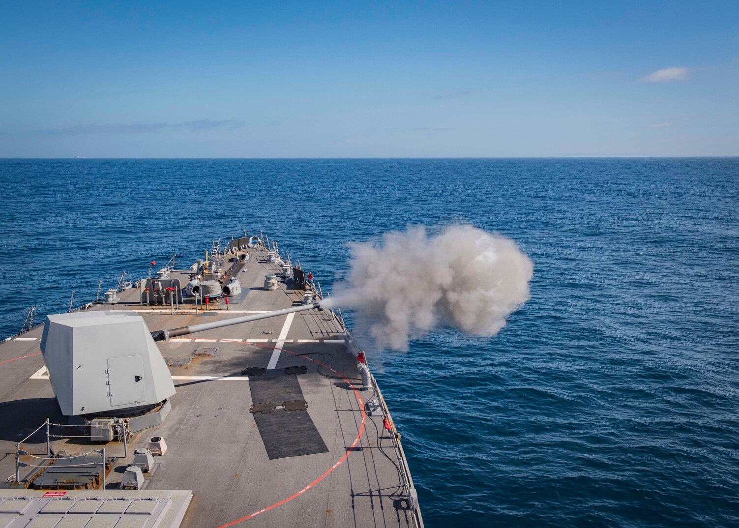 180221-N-UB406-0439 ATLANTIC OCEAN (Feb. 21, 2018) The guided-missile destroyer USS Bulkeley (DDG 84) fires its Mark 45 5-inch gun during an integrated live-fire exercise. Bulkeley is underway as part of the Harry S. Truman Carrier Strike Group (HSTCSG) composite training unit exercise (COMPTUEX), which evaluates the strike group's ability as a whole to carry out sustained combat operations from the sea - ultimately certifying the HSTCSG for deployment. (U.S. Navy photo by Mass Communication Specialist 3rd Class Cameron M. Stoner/Released)