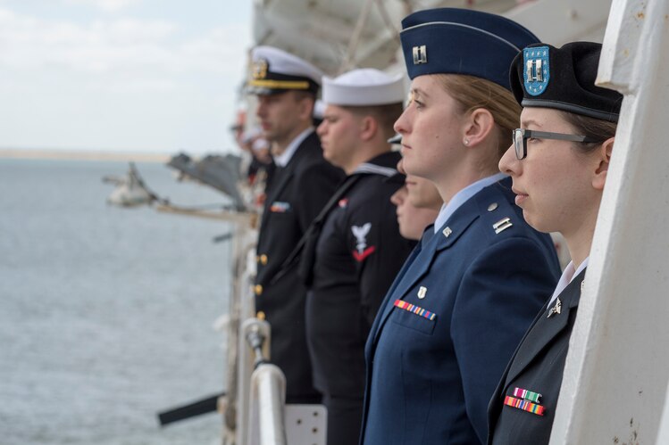 180223-N-ZW825-0451 SAN DIEGO (Feb. 23, 2018) U.S. Navy, Air Force, and Army personnel embarked aboard the Military Sealift Command hospital ship USNS Mercy (T-AH 19) man the rails as the ship departs Naval Base San Diego in support of Pacific Partnership 2018 (PP 18). PP18’s mission is to work collectively with host and partner nations to enhance regional interoperability and disaster response capabilities, increase stability and security in the region, and foster new and enduring friendships across the Indo-Asia-Pacific Region. Pacific Partnership, now in its 13th iteration, is the largest annual multinational humanitarian assistance and disaster relief preparedness mission conducted in the Indo-Asia-Pacific (U.S. Navy photo by Mass Communication Specialist 1st Class Byron C. Linder/Released)