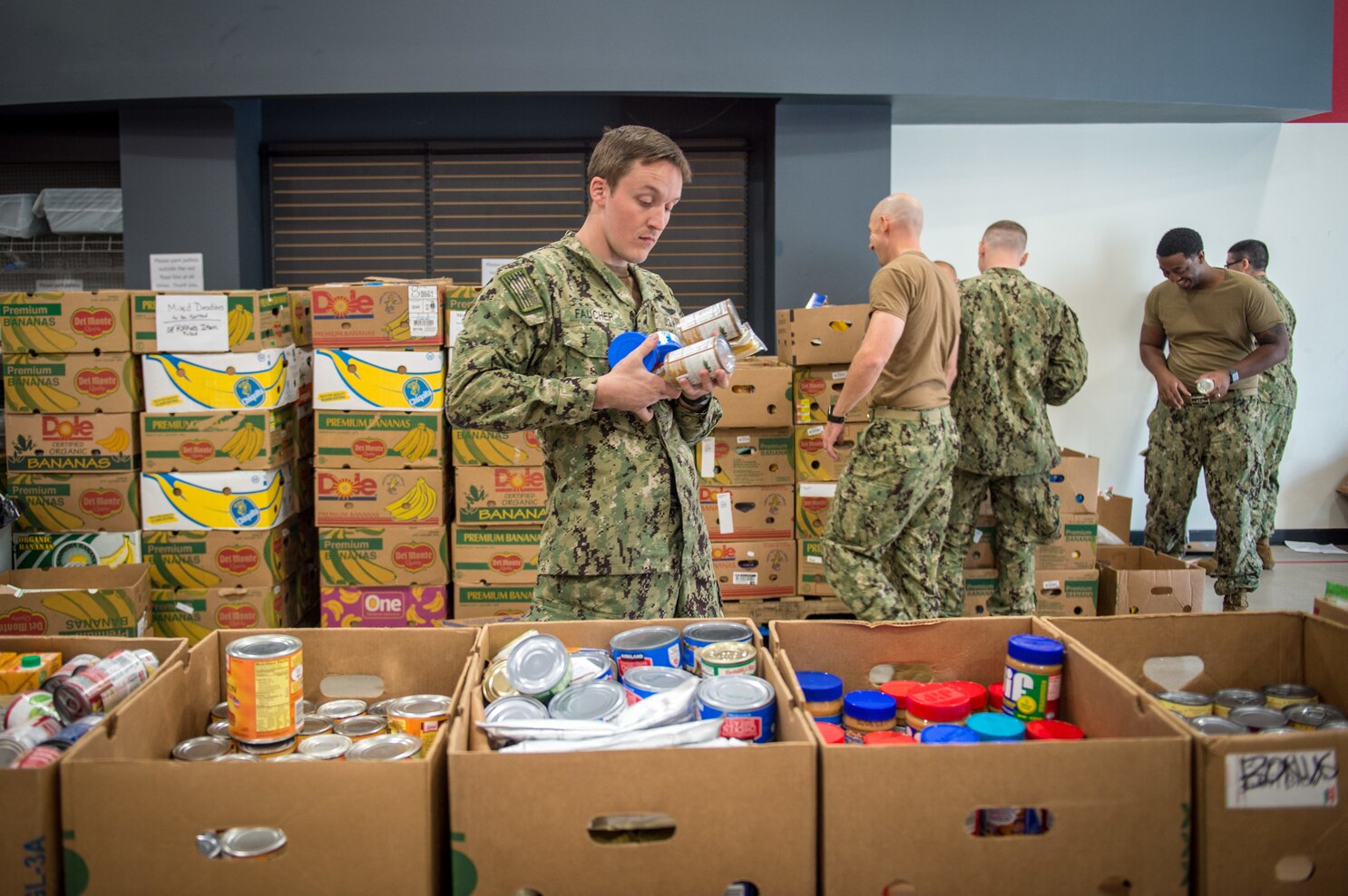 180317-N-ND254-0059 OLYMPIA, Wash. (March 17, 2017) Sailors assigned to the Los Angeles-class fast-attack submarine USS Olympia (SSN 717) sort through donated food items for the Thurston County Food Bank in downtown Olympia, Wash., March 17, 2018. Sailors split up into four groups and spread out across the city to complete projects like filling 1000 backpacks with food to feed homeless children, assisting at two food banks, and clearing indigenous brush from forested areas in LBA park ahead of Arbor Day during a namesake visit to the Pacific Northwest. Commissioned on Nov. 17, 1984, USS Olympia is the second ship of the United States Navy to be named after Olympia, Washington. (U.S. Navy photo by Mass Communication Specialist 2nd Class Nancy C. diBenedetto/Released)