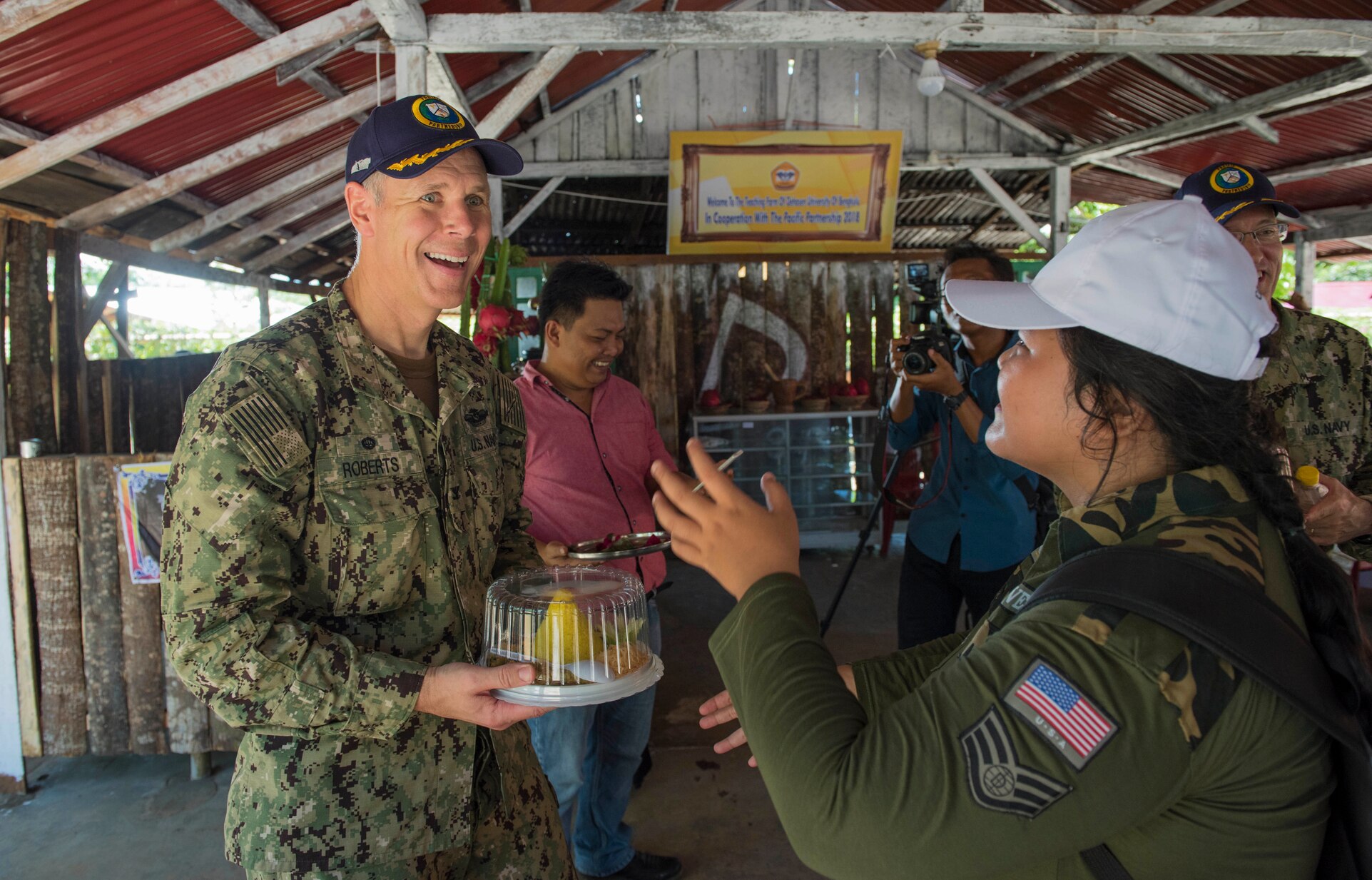 180331-N-OU129-337 BENGKULU, Indonesia (March 31, 2018) Capt. Peter Roberts, commanding officer of the U.S. Navy hospital ship USNS Mercy (T-AH 19), is given traditional Indonesian cuisine by a local resident during a cultural exchange event at Teaching Farm University Dehasen in Bengkulu, Indonesia, during Pacific Partnership (PP) 2018. PP-18's mission is to work collectively with host and partner nations to enhance regional interoperability and disaster response capabilities, increase stability and security in the region and foster new and enduring friendships across the Indo-Pacific region. (U.S. Navy photo by Mass Communication Specialist 2nd Class Joshua Fulton/Released)