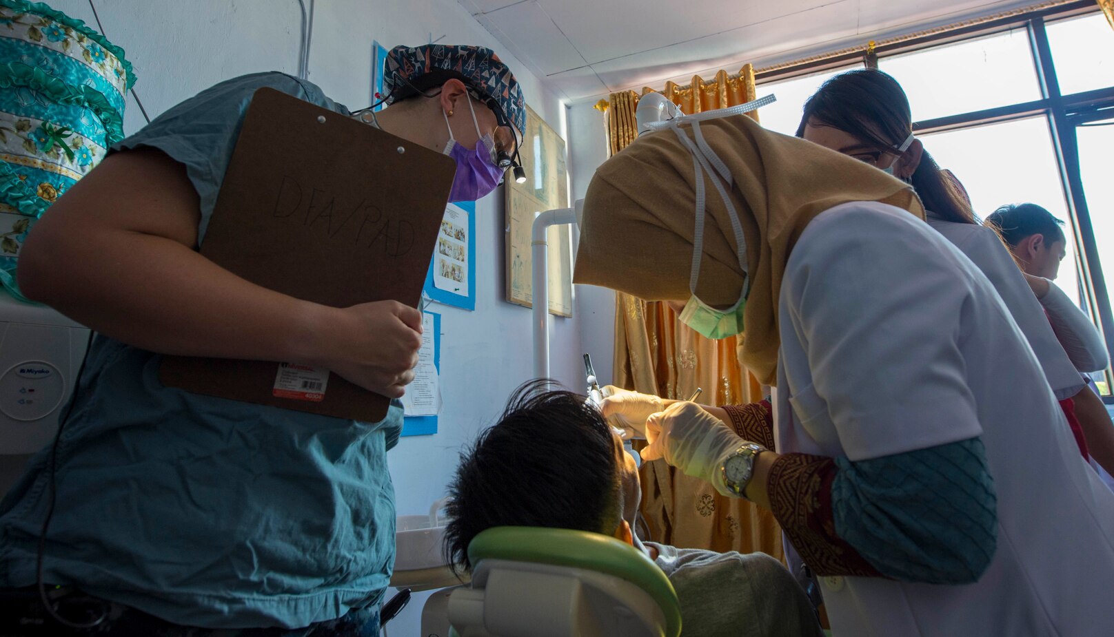 180402-N-MD713-0150 BENGKULU, Indonesia (April 2, 2018) Lt. Bethany Brooks, left,assigned to the U.S. Navy hospital ship USNS Mercy (T-AH 19), works alongside Indonesian dentists during a collaborative health engagement in support of Pacific Partnership (PP) 2018. PP-18's mission is to work collectively with host and partner nations to enhance regional interoperability and disaster response capabilities, increase stability and security in the region and foster new and enduring friendships across the Indo-Pacific region. (U.S. Navy photo by Mass Communication Specialist 3rd Class Cameron Pinske/Released)