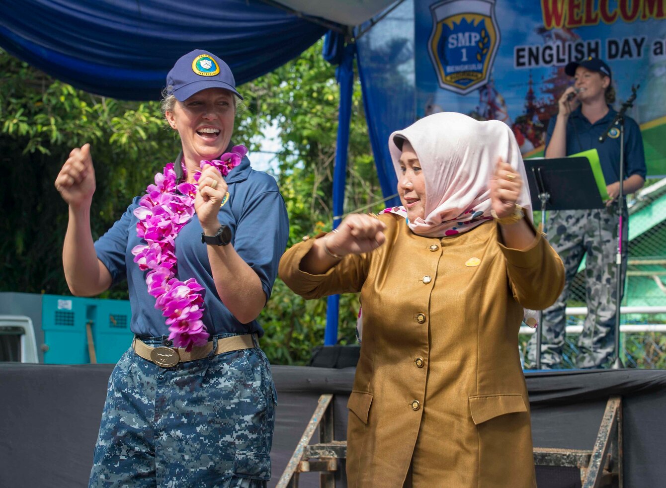 180402-N-NH199-0005 BENGKULU, Indonesia (April 2, 2018) Lt. Kelly Cartwright, assigned to the U.S. Navy hospital ship USNS Mercy (T-AH 19), dances with a teacher from SMP Negeri 1 Junior High School during a community relation’s culture exchange and band performance. Mercy is deployed in support of Pacific Partnership 2018, whose mission is to work collectively with host and partner nations to enhance regional interoperability and disaster response capabilities, increase stability and security in the region and foster new and enduring friendships across the Indo-Pacific region. (U.S. Navy video by Mass Communication Specialist Seaman Harley K. Sarmiento/Released)